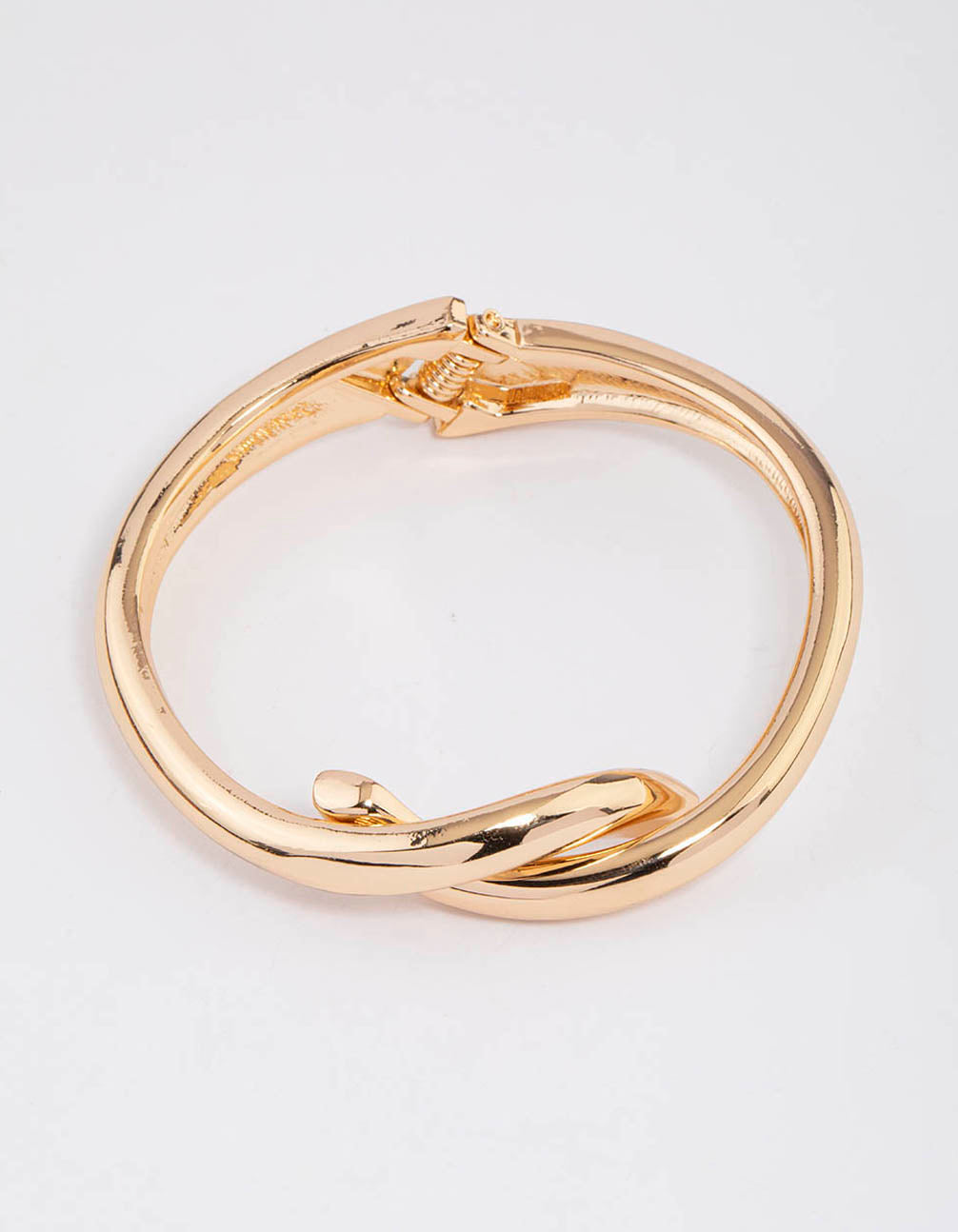 - This simple, gold-toned bangle features a hinge clasp and knotted, interlaced design for added interest. Pair this bangle with a simple, gold chain bracelet for a layered look.