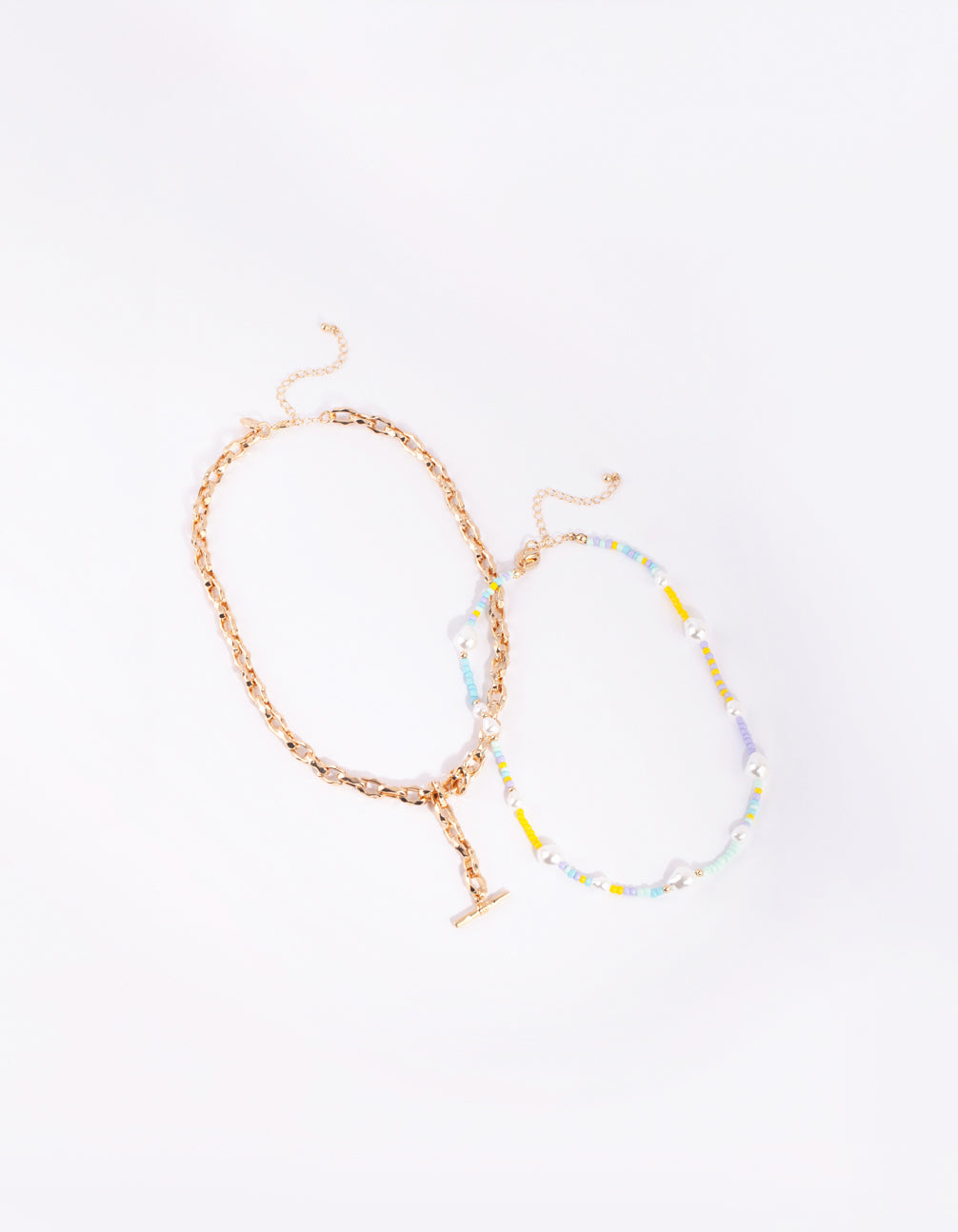 Gold-toned accessories are chic and versatile. This on-trend necklace features a funky chain design that's sure to impress. It features a 90s-inspired design with colourful beads and faux pearls. Wear it and shine like it's 1999.