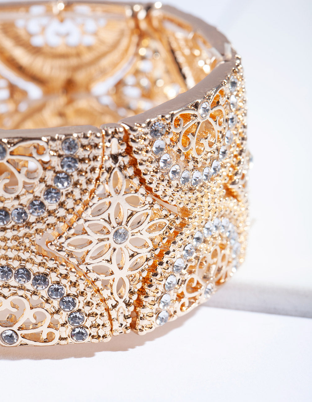 Elevate your outfit with a bracelet stack! This style boasts a filigree diamante stretch design in a gold tone. Wear individually, stacked or mix and match for an eclectic look!