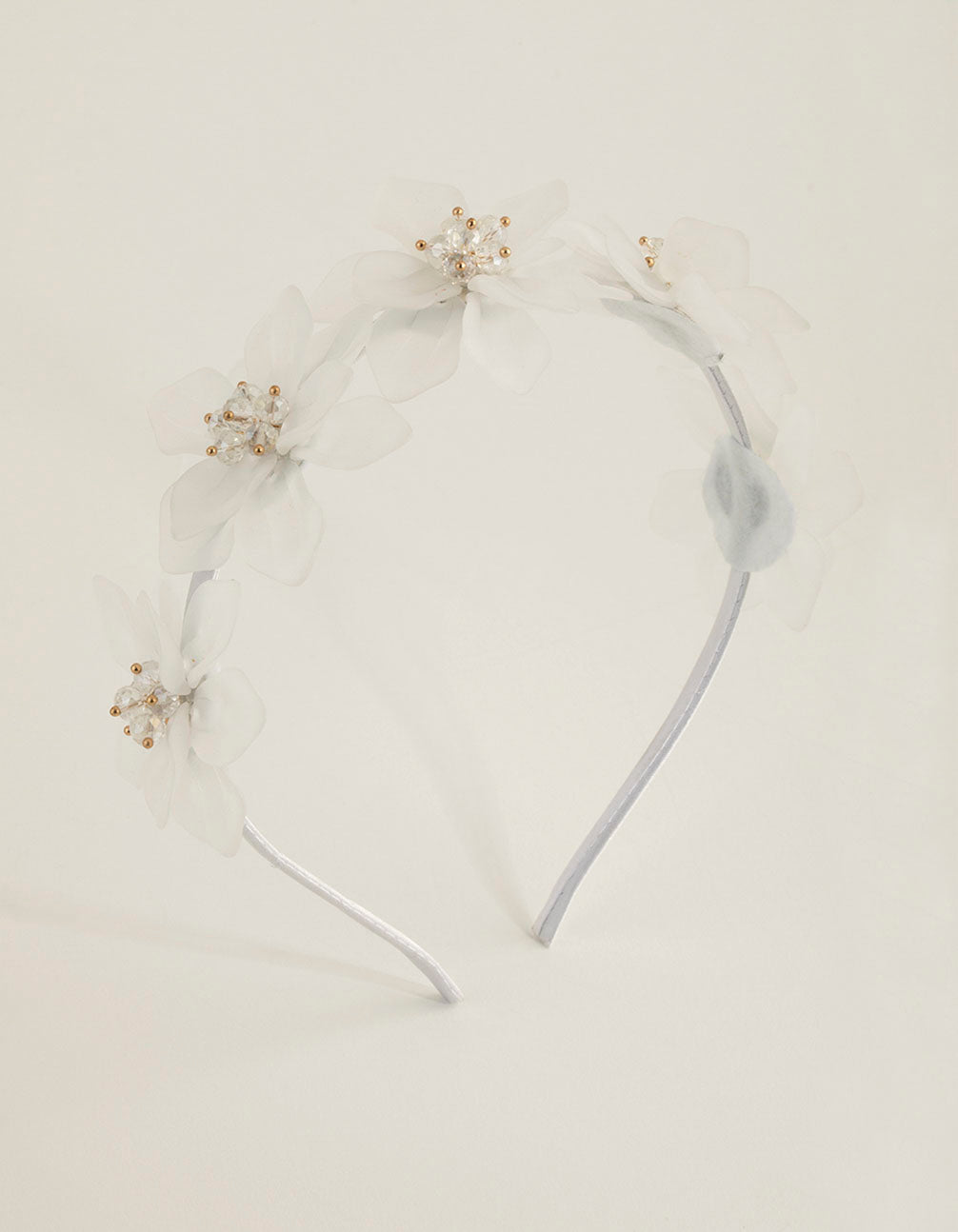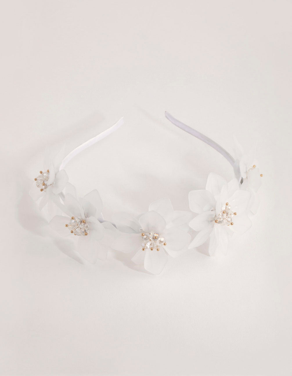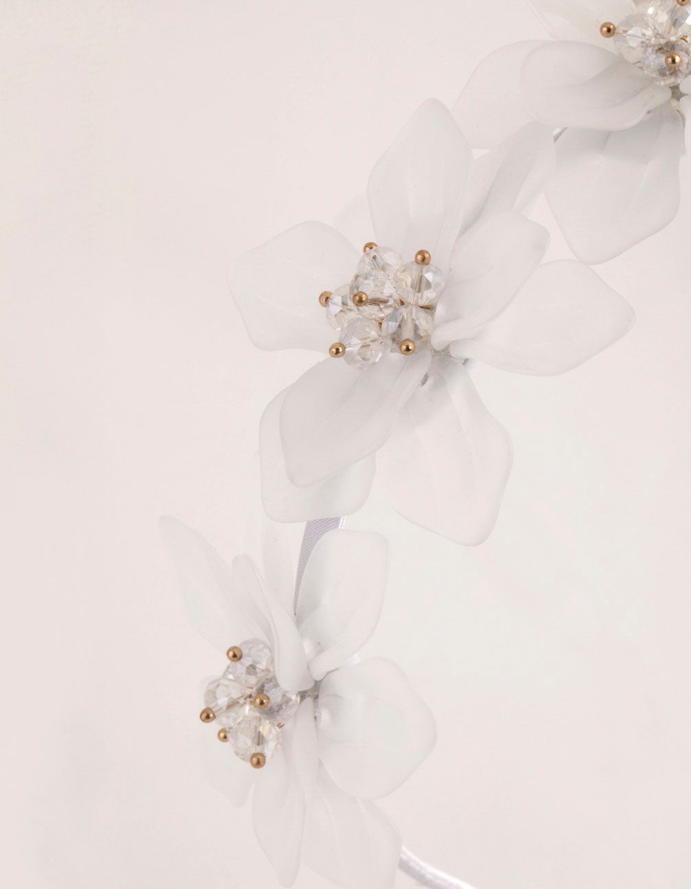 Dress up an occassion look with statement headbands! This beautiful alice band boasts an impresive flower design with a frosted finish. Each flower has crystal-like diamantes at their centre in lieu of buds. This piece will add the perfect finishing touch.