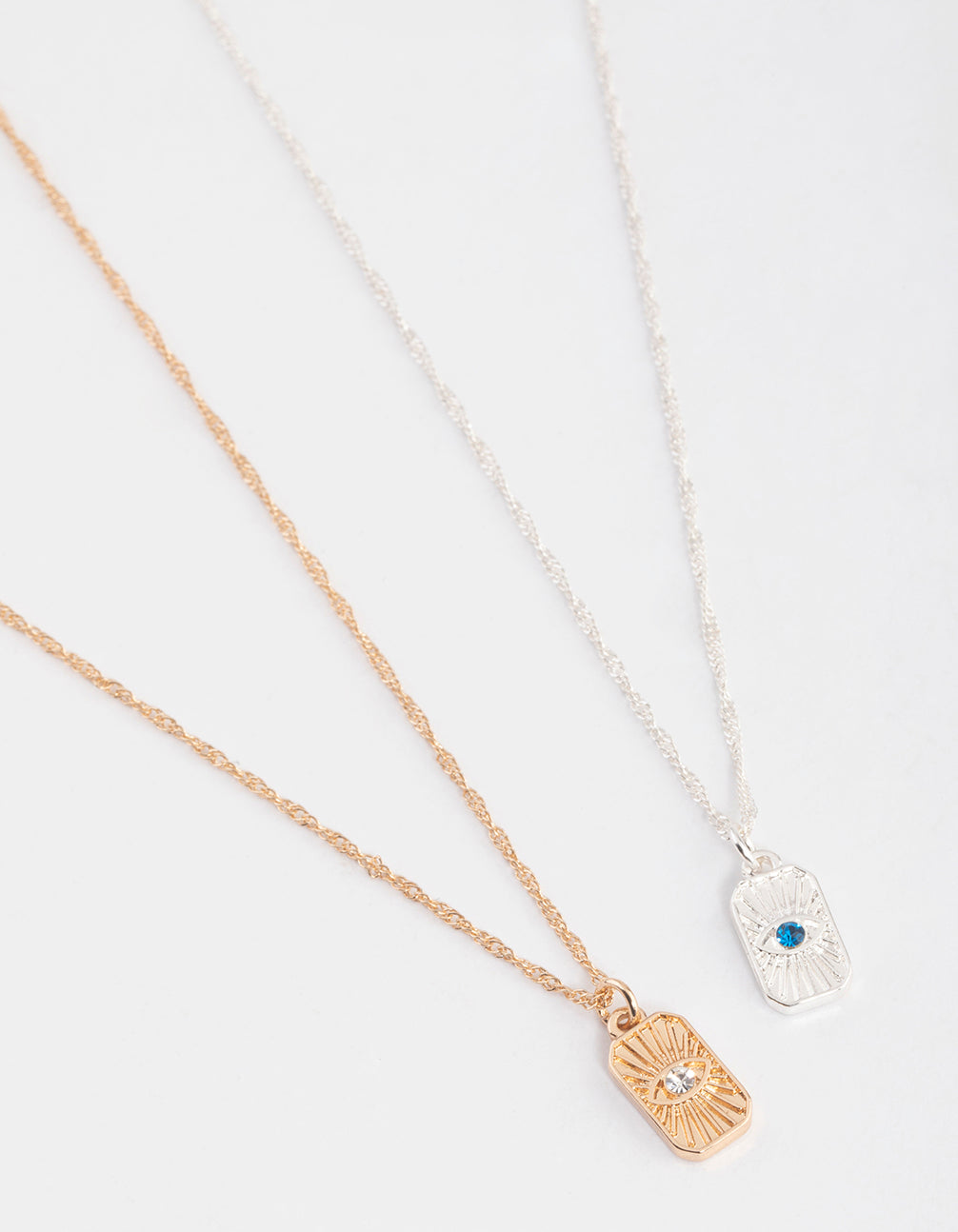 Protect your energy and bring good vibes to your loved ones with this Mixed Metal Evil Eye Pendant Necklace 2-Pack, featuring two delicate pendants. This necklace set comes wrapped and ready to gift in a Lovisa gift box, making it the perfect gift for yourself or a loved one.