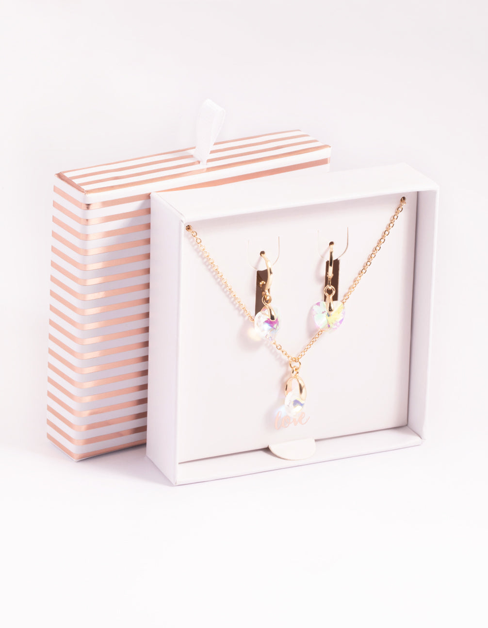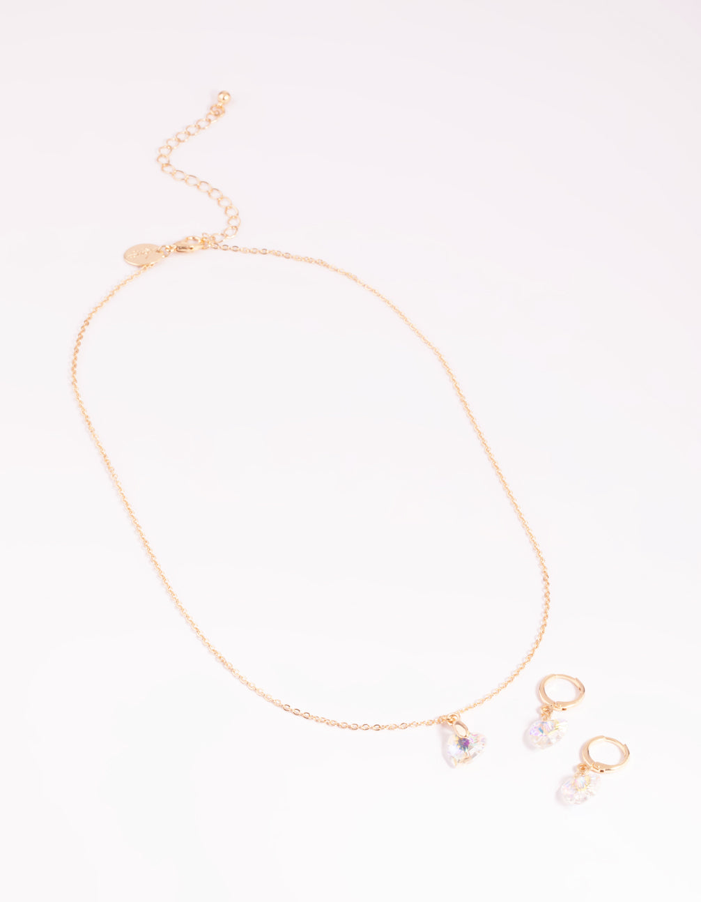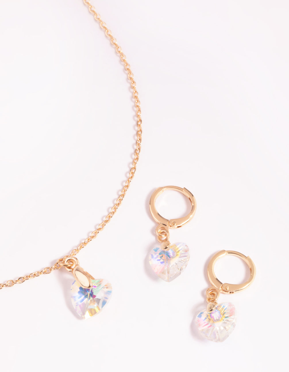 Iridescent Diamante Heart Necklac eand Huggie Hoop Earrings