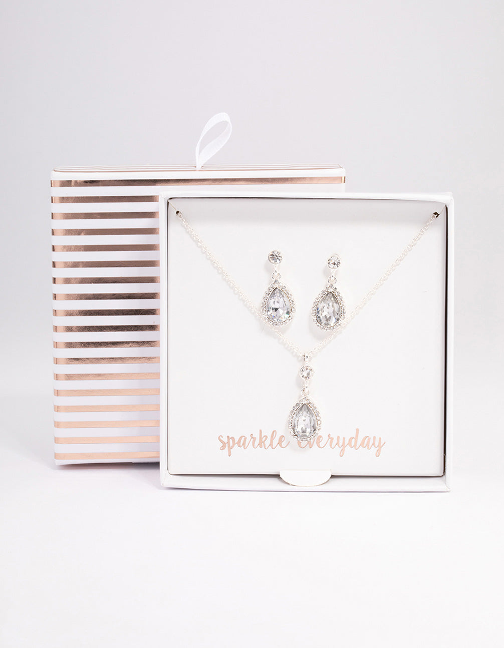 Spakle every day with this timeless, silver jewellery set. This set contains a teardrop pendant necklace and pair of dazzling drop earrings to match.