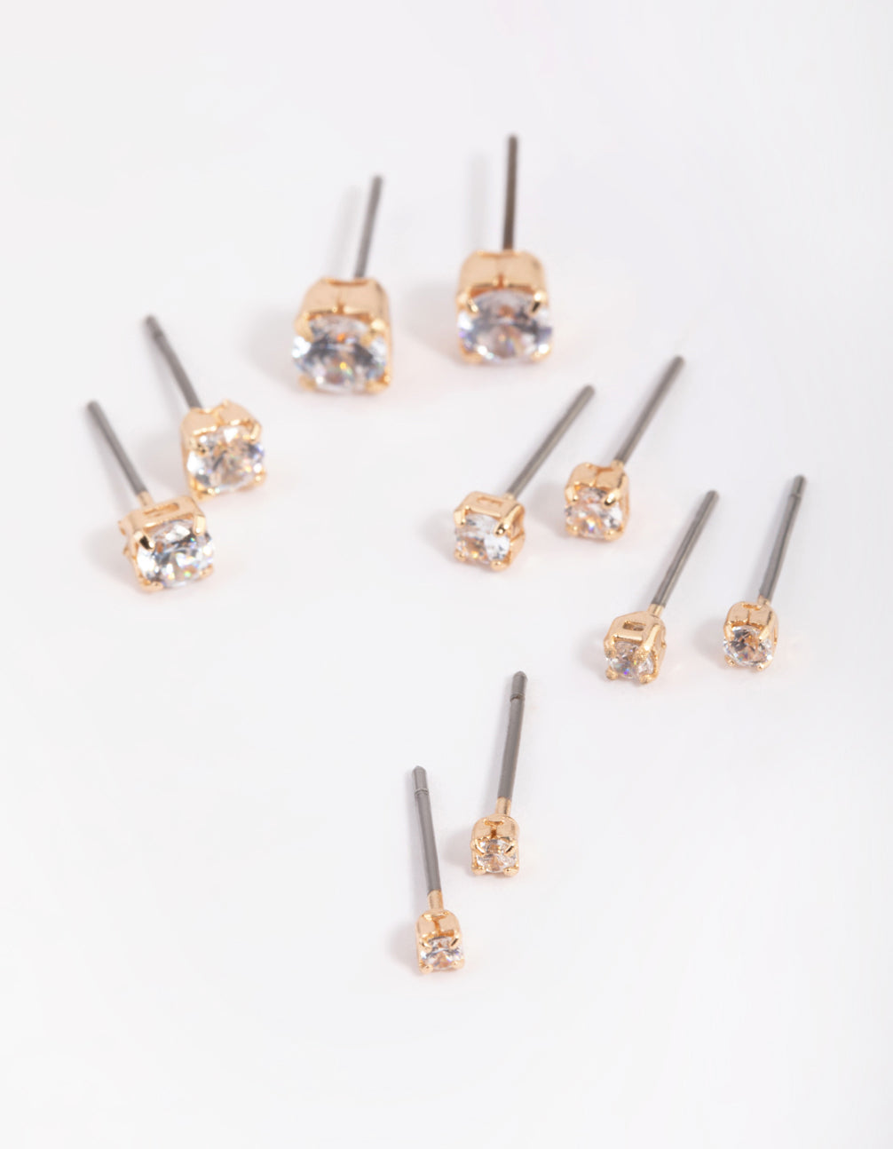 You can't go wrong with classic gold accessories! Chic and timeless, style them up or down for a clean and classic look. This gold-toned earring pack features five pairs of stud earrings with diamante embellishments. Wear them and shine.