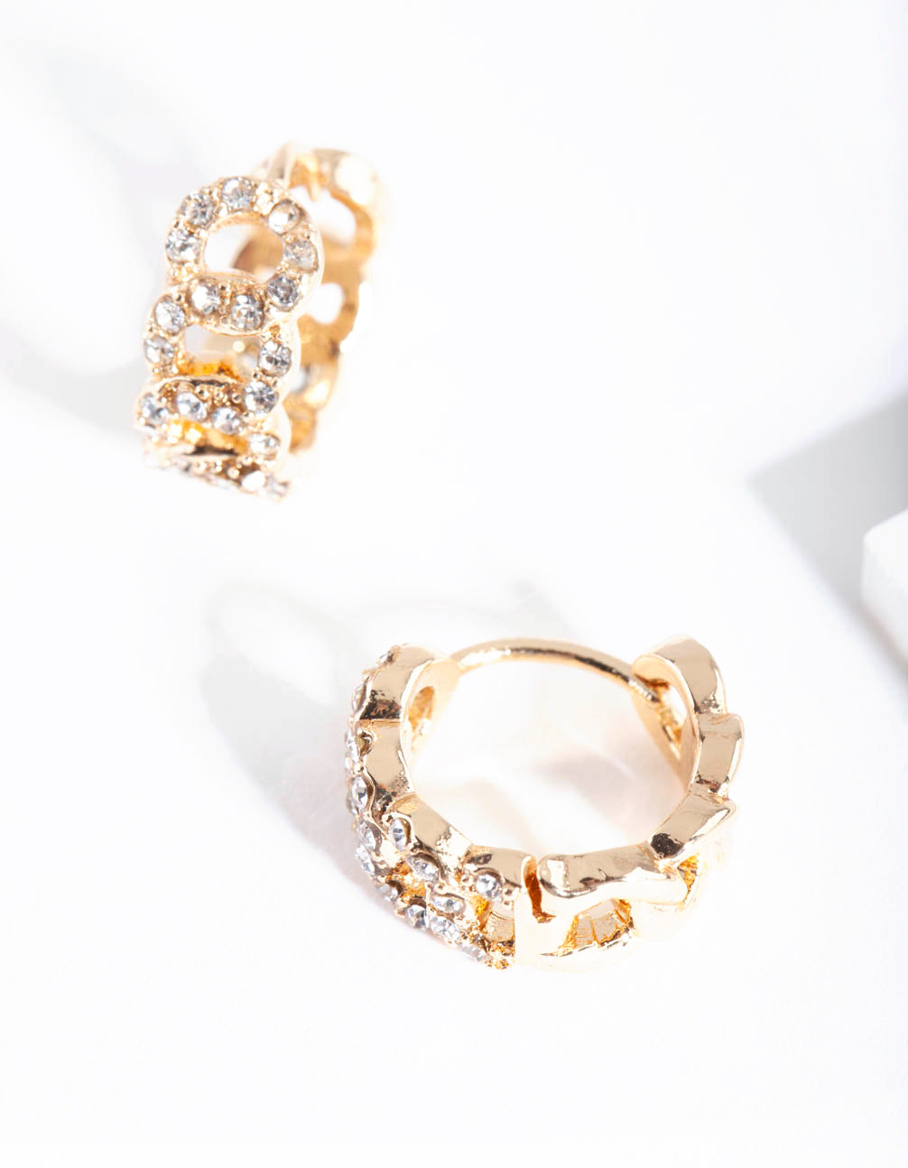 Add some subtle glam to your outfit with these gold-tone hoop earrings featuring a link design adorned with pave diamantes.