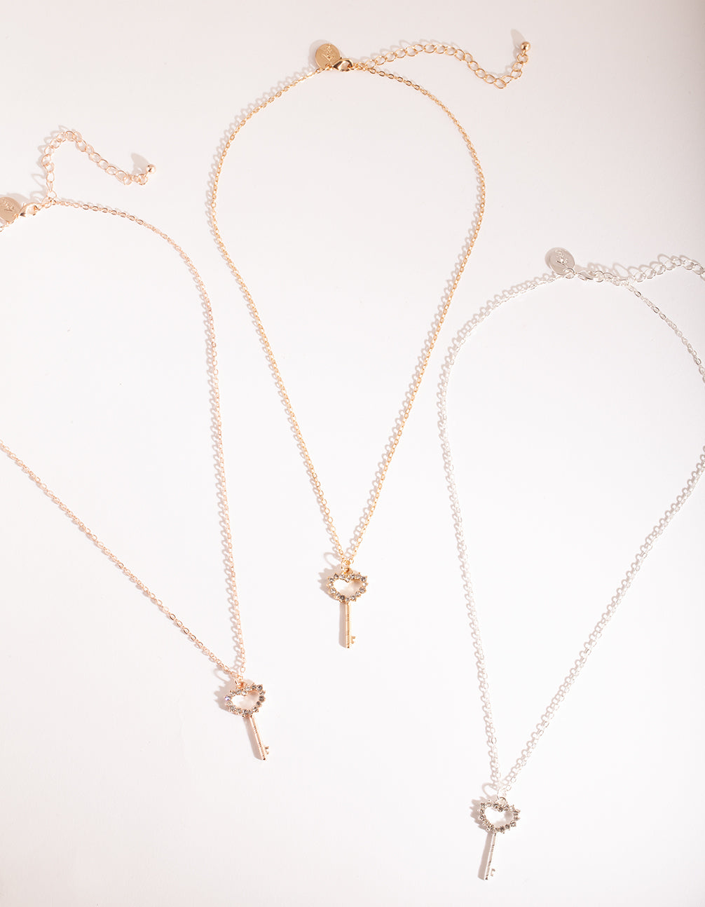 This pack comes with a trio of mixed metal designs with diamante key pendants.