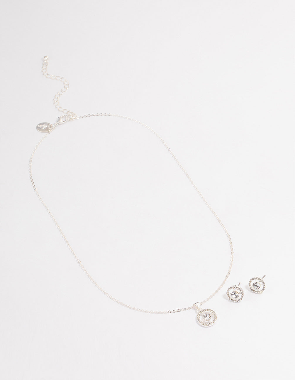 Discover the perfect gift for someone you love with a jewellery box set. This duo features a necklace and earrings with a timeless silver-toned setting and halo crystal design.