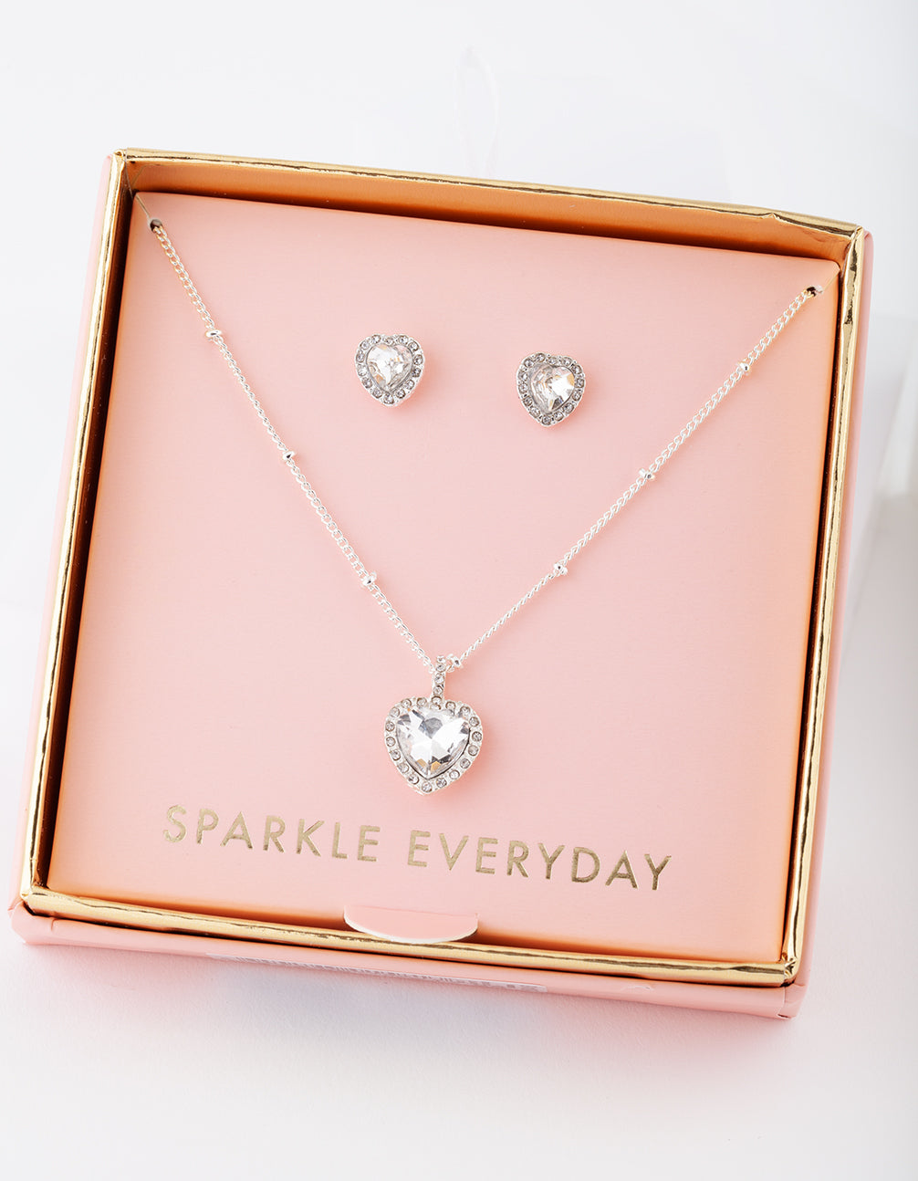 Shareable, giftable and packed in pretty packaging. Lovisa gift-boxes take the stress out of gift giving. This gift box comes with a pair of earrings and a necklace in heart shaped designs.