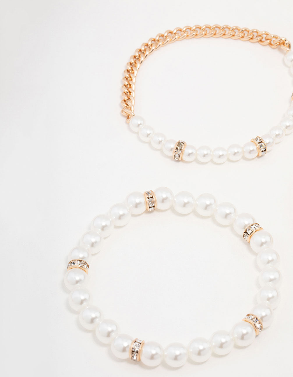 Create your chicest stack with this stunning bracelet pack! Featuring three gold-tone styles with pearls and gold decals, it's perfect for adding a touch of glamorous flair or making a subtle statement.