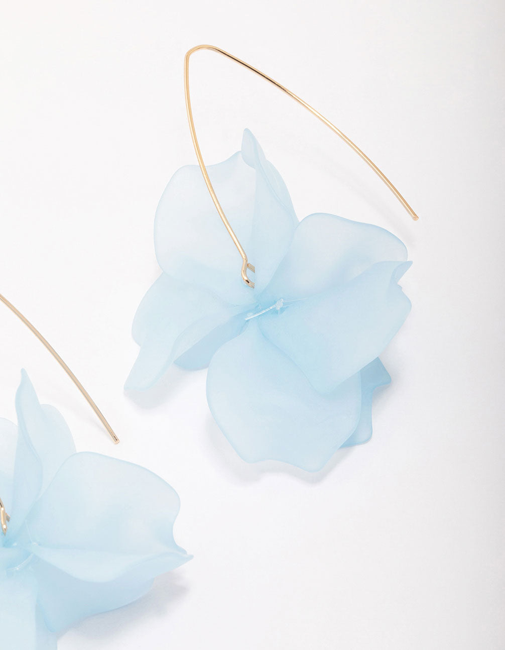 These stunning drop earrings feature a fine, gold-toned chain adorned with beautiful frosted blue flowers for a feminine touch.