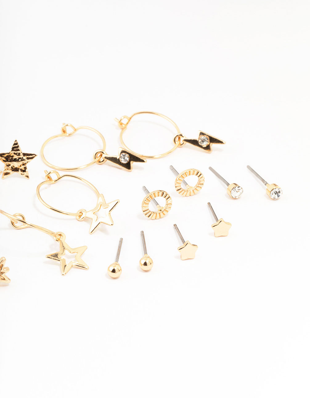 Create the ultimate fun ear stack with these ethereal Gold Celestial Cross Earrings. Channel your inner starry night vibe with pretty moon, star and lightning motifs and bring some glam with the classic cross motif earrings for a more elegant feel.