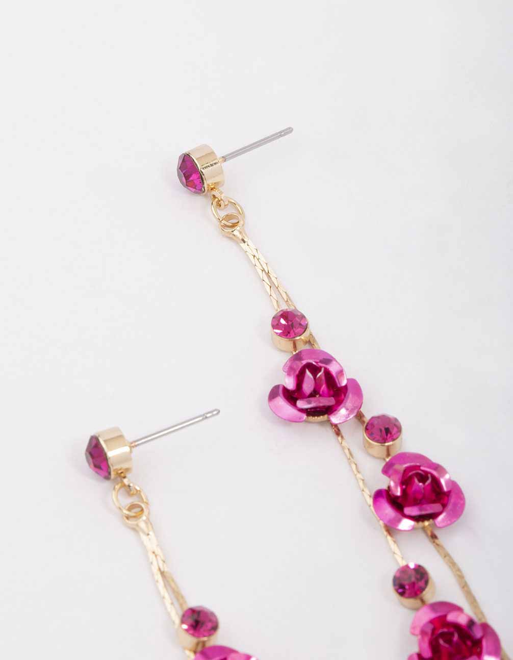 These vibrant drop earrings feature a gorgeous, gold-toned setting adorned with hot pink flowers for a standout finish to your stack.