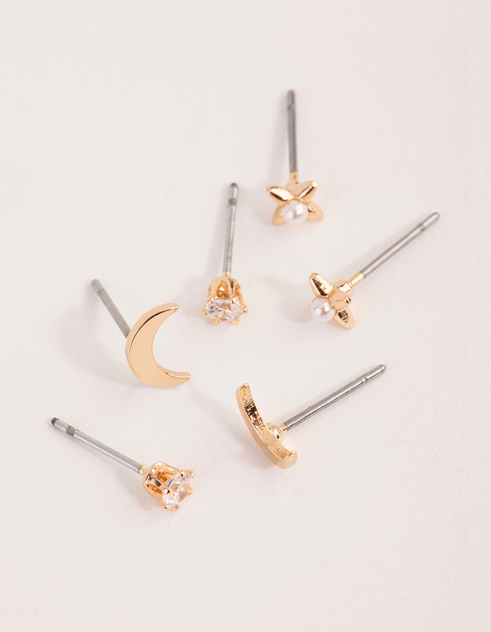 Mix them, match them, stack them! This set is perfect for customising your ear stack! It features a series of gold-toned micro studs with star and moon designs and faux pearl and diamante details. Get stacking!