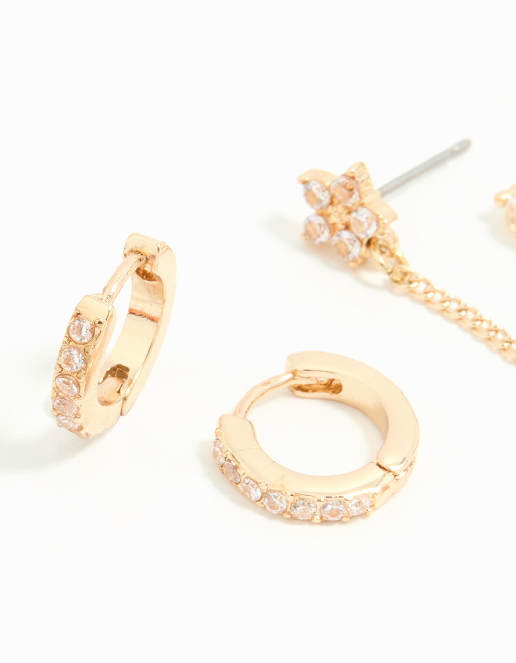 Gold Cubic Zirconia Chain & Flower Huggie Earrings 2-Pack