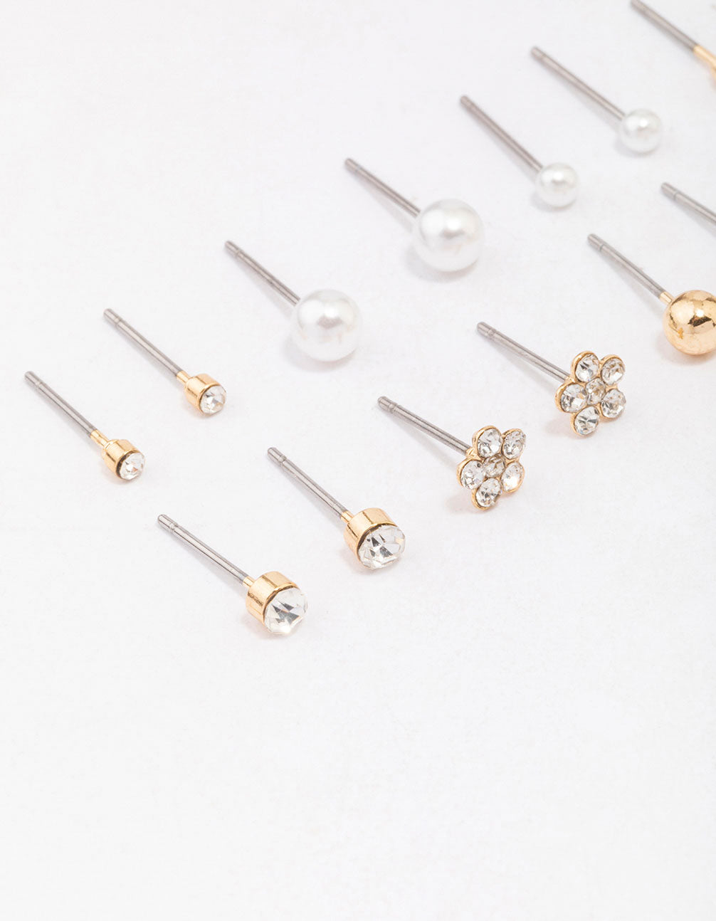 Create the ear stack of your dreams with this pack of classic stud earrings. This earring pack includes eight pairs of studs, each adorned with round diamantes and pearls for a refined finish.