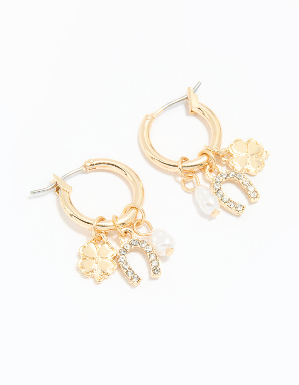 Gold Diamante Horseshoe & Clover Huggie Earrings