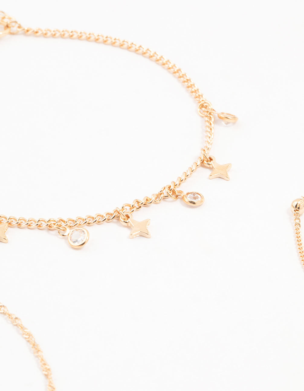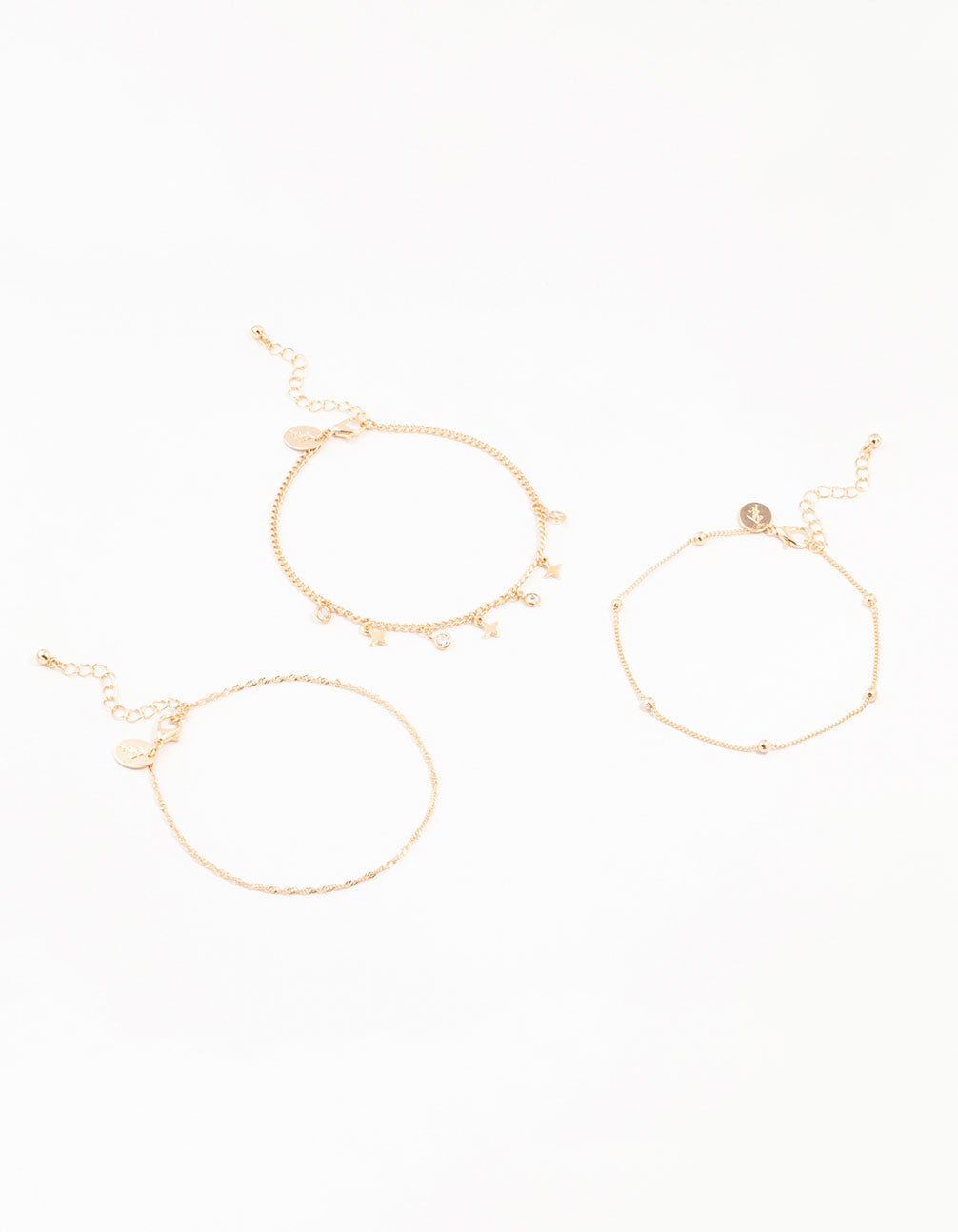 Channel your inner starlet with this set of three gold anklets, ideal for sleek and effortlessly cool styling. Featuring star droplets, gold balls, and a twisted chain design, mix and match for a contrasting look or wear solo for subtle elegance.