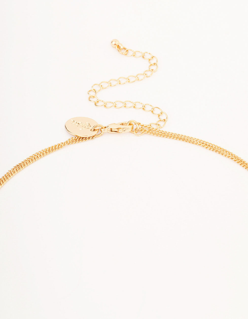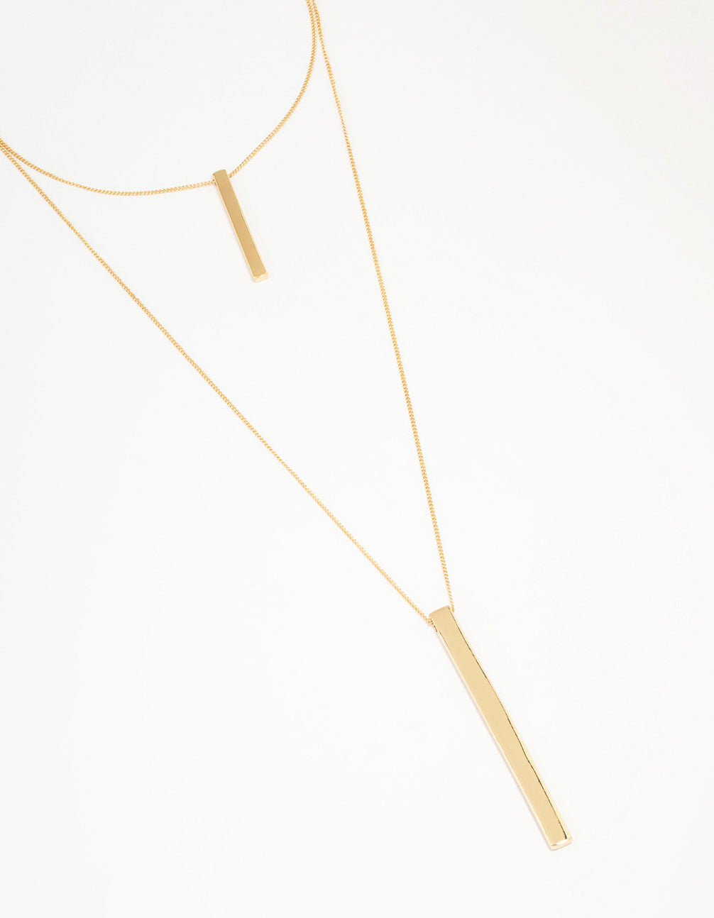 This chain necklace features two rows of long, dainty chain necklaces. This layered necklace features two long chains, each designed with a long bar for a boho-inspired look.