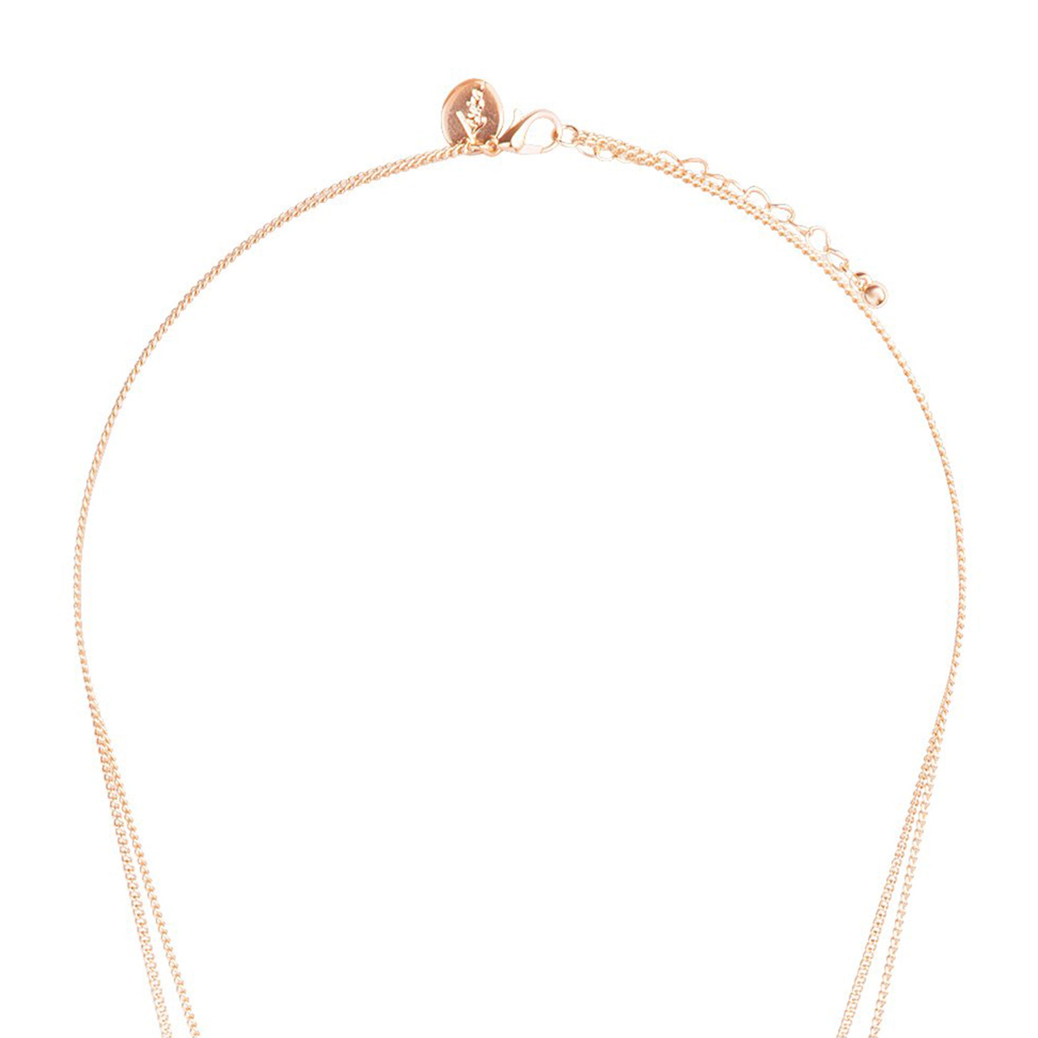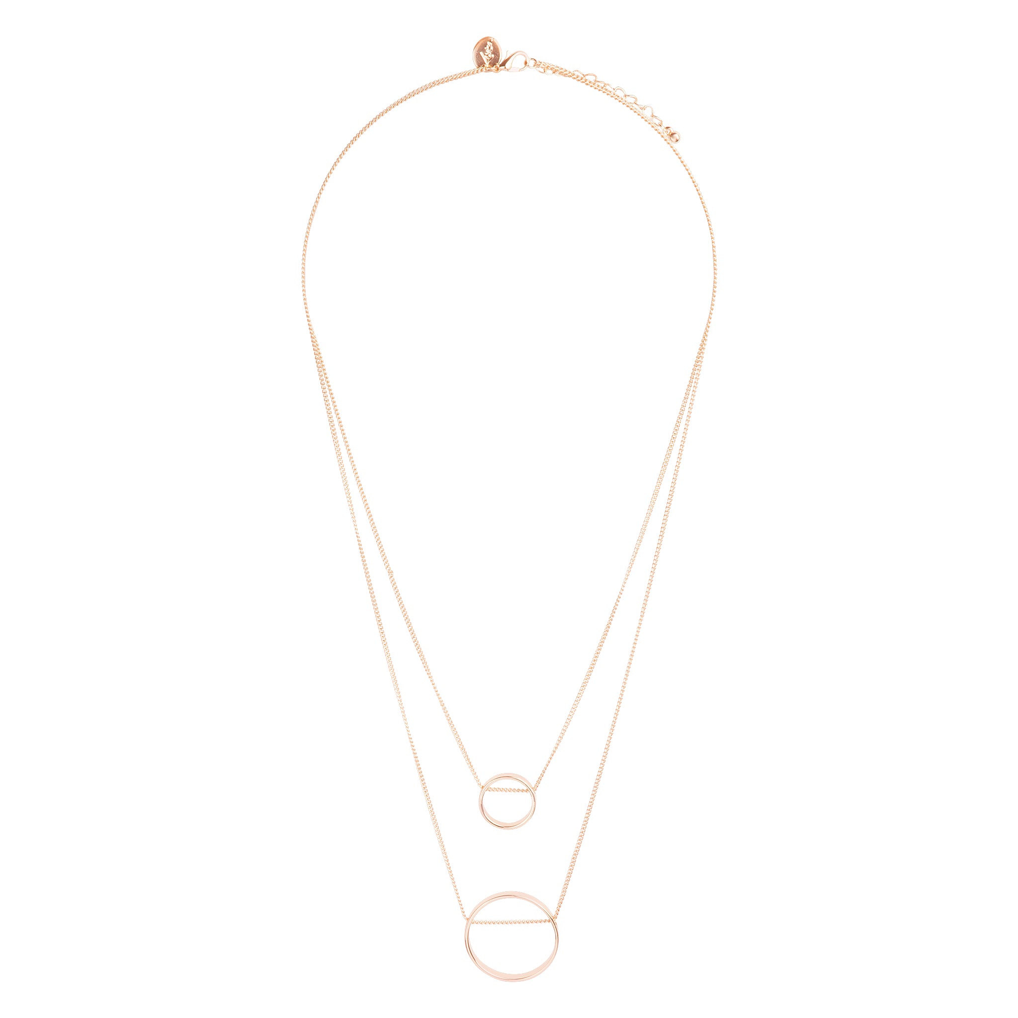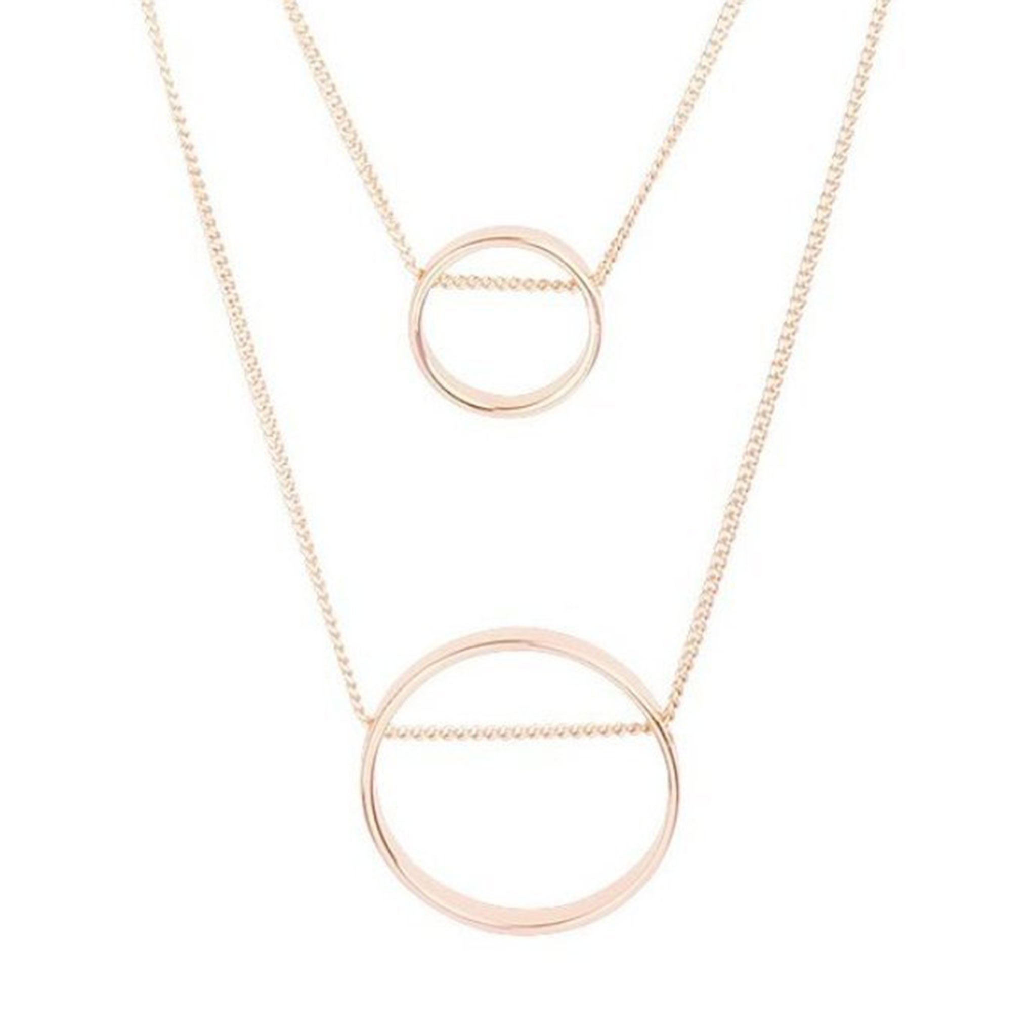 Two polished ring pendants in gold tone are suspended from fine layered chains creating a simple, streamline feel.