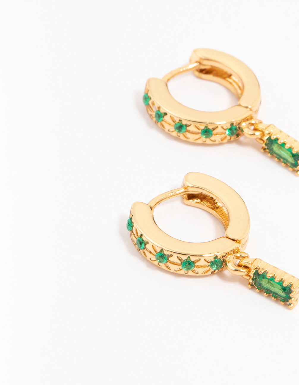 Gold Plated Emerald Baguette Celestial Huggie Earrings