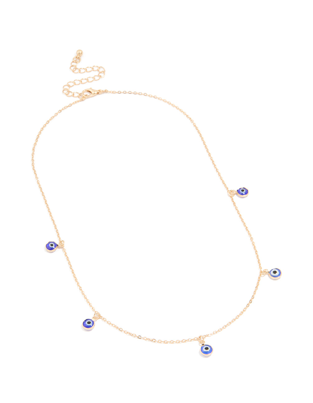Add a pop of charm to your look with this Gold Enamel Evil Eye Necklace. Featuring a delicate gold-tone chain adorned with enamel protective evil eye charms, this necklace is both playful and meaningful. Ideal for layering or wearing solo, it pairs effortlessly with a casual tee for a laid-back vibe or a sleek black dress for a polished finish. Whether you're dressing up for a dinner date or keeping it cool at a weekend brunch, this piece is the ultimate versatile jewellery staple. Perfect for anyone who loves timeless necklaces with a modern twist! Also perfect for warding off bad vibes.