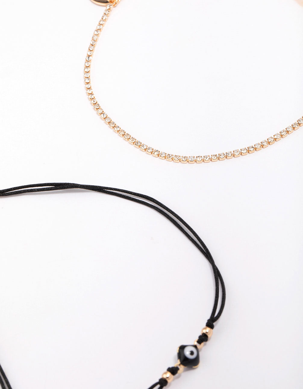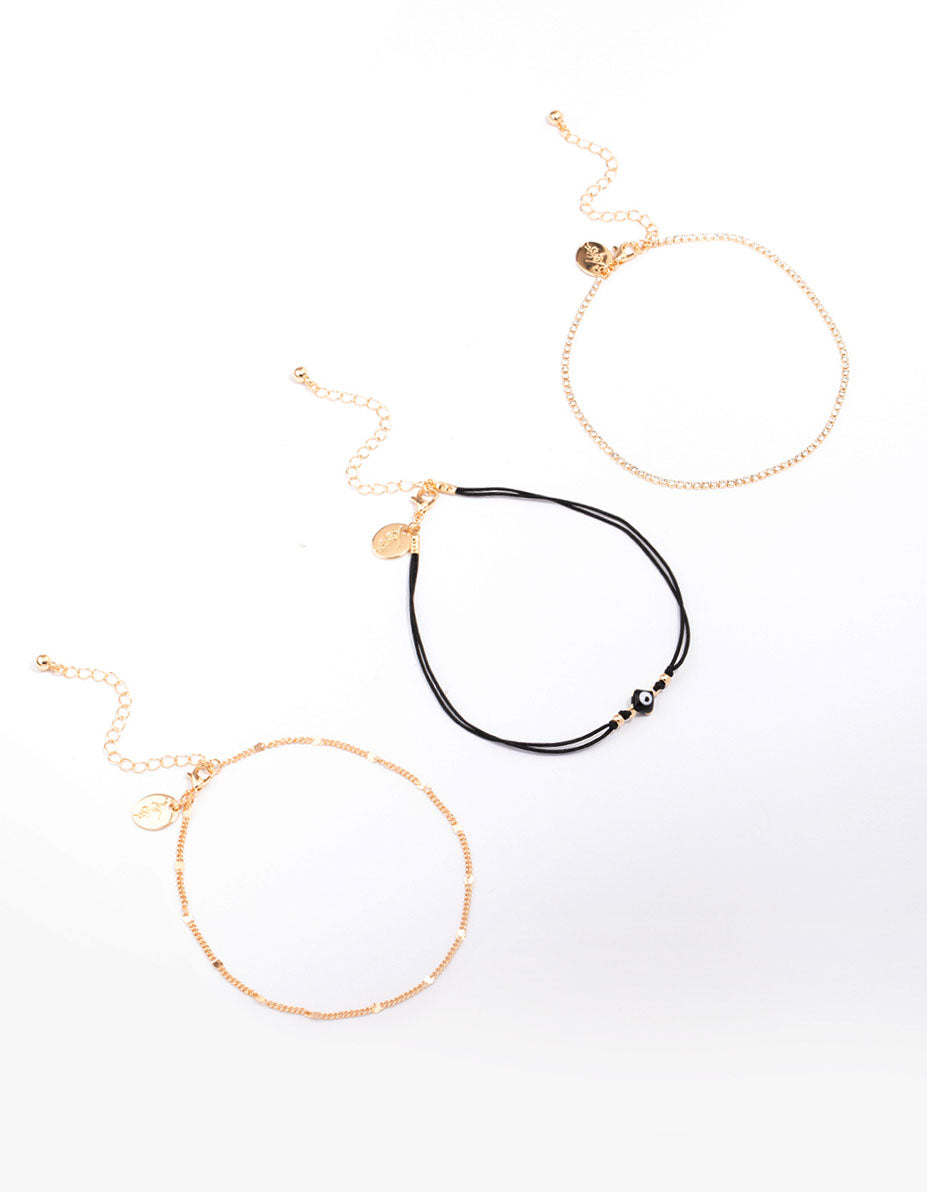 Anklets are trending! Style the trend yourself with this pack of three gold anklets, each adorned with a mix of evil eye charms for a curated finish. Style them layered together for a maximalist look, or solo for something more understated.