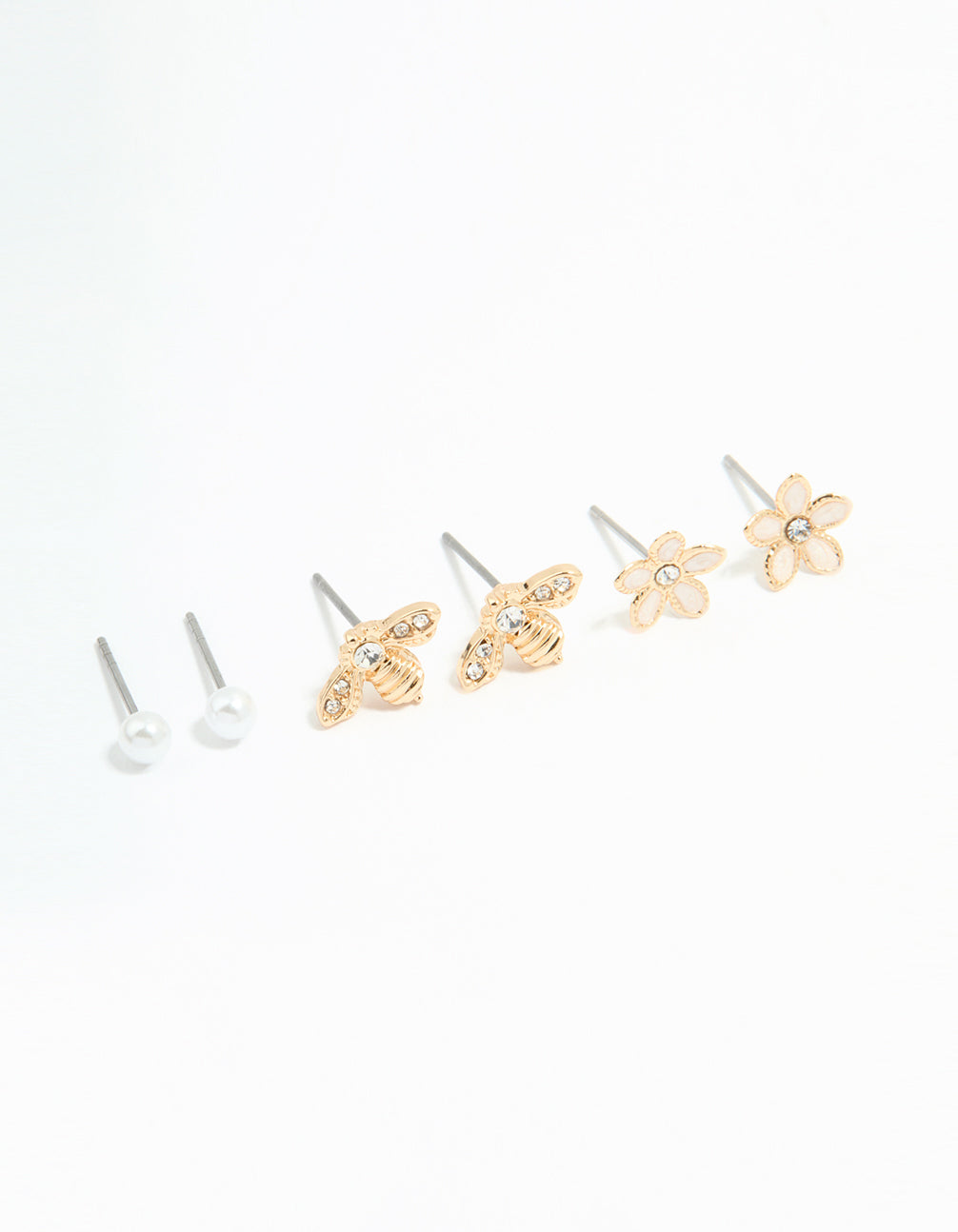 Elevate your accessory game with this Gold Flower & Bee Stud Earrings Pack. This set features three pairs of stud earrings: classic pearl studs for timeless charm, sparkling diamante bee studs for a quirky vibe, and delicate gold flower studs for a feminine flair. Whether you're dressing up for an evening out or adding a little glam to your everyday outfit, these gold-tone earrings are a versatile must-have. Pair them with a flowy dress for a romantic look, or mix and match with other studs for a stylish, stacked-ear style. Perfect for gifting or treating yourself, these stud earrings bring both fun and sophistication to your jewellery collection!