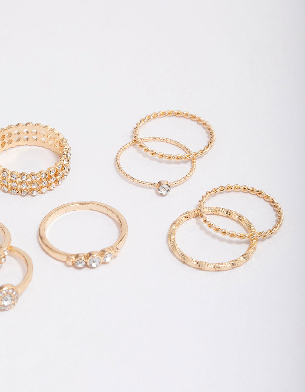 Complete your outfit with this set of twelve, gold-toned rings. This pack contains a mix textured and diamante-studded rings, perfect for adding dimension and interest to your stack.