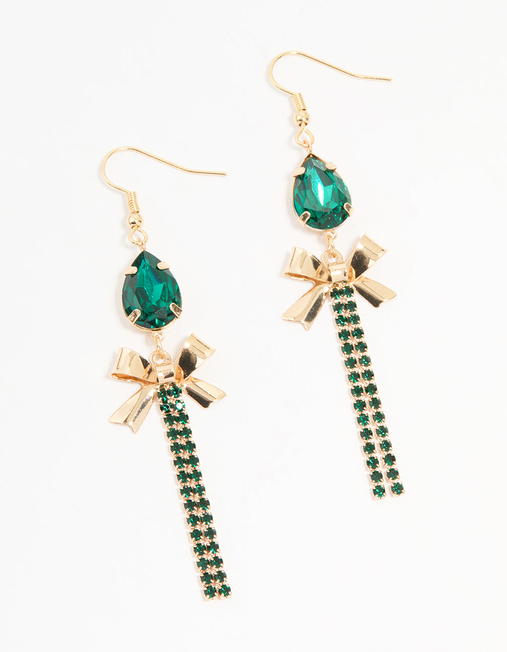 Gold Green Diamante Bow Cupchain Drop Earrings