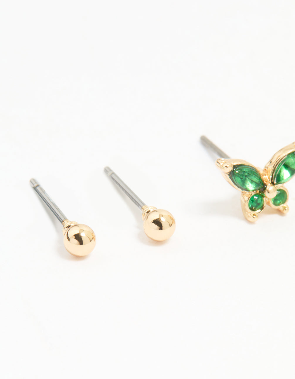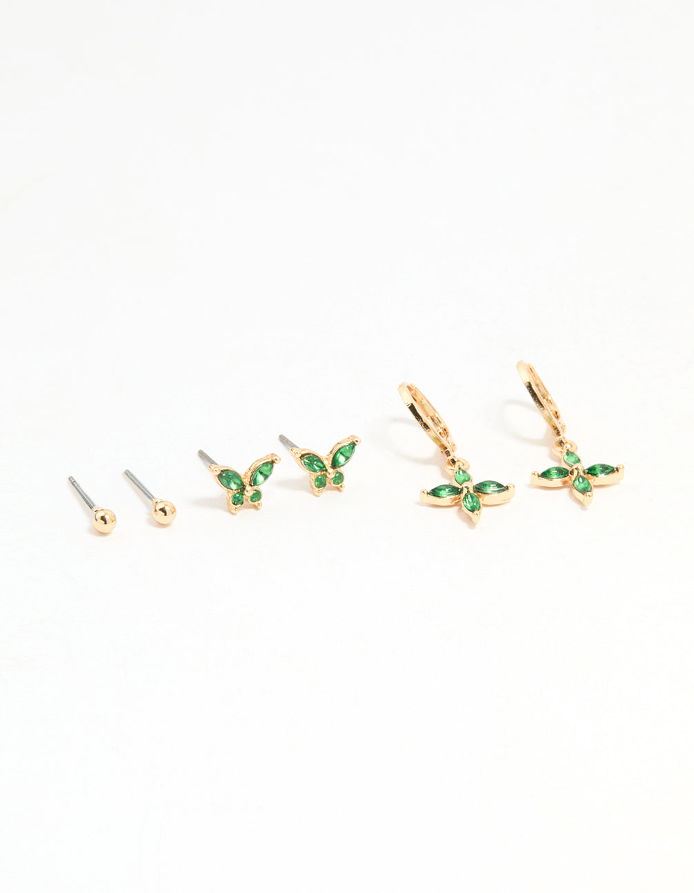 Gold Green Diamante Butterfly & Cross Mixed Stud Earrings 3-Pack