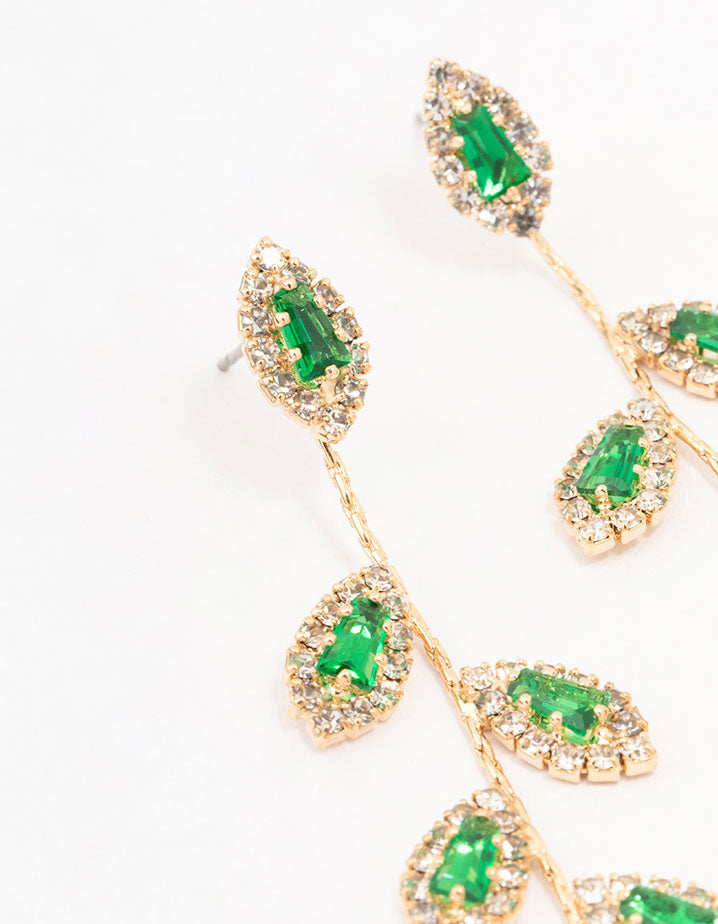 Gold Green Diamante Leaf Drop Earrings