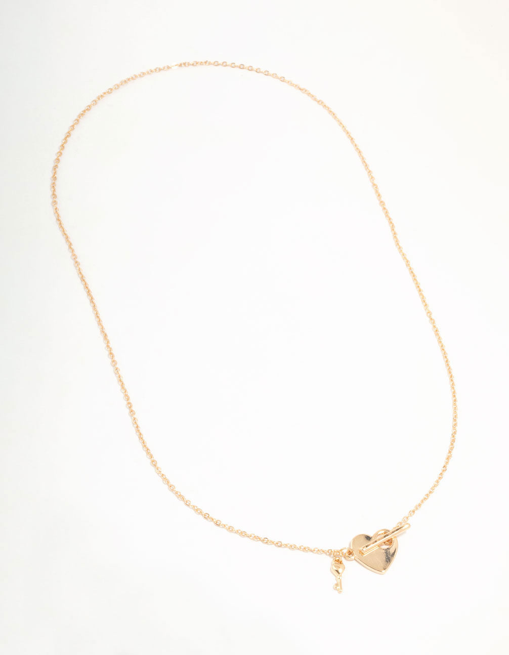 Unlock your style with this gleaming gold-tone necklace. Featuring a chic heart charm and delicate key pendant, it's a timeless treasure that symbolises love and new possibilities.
