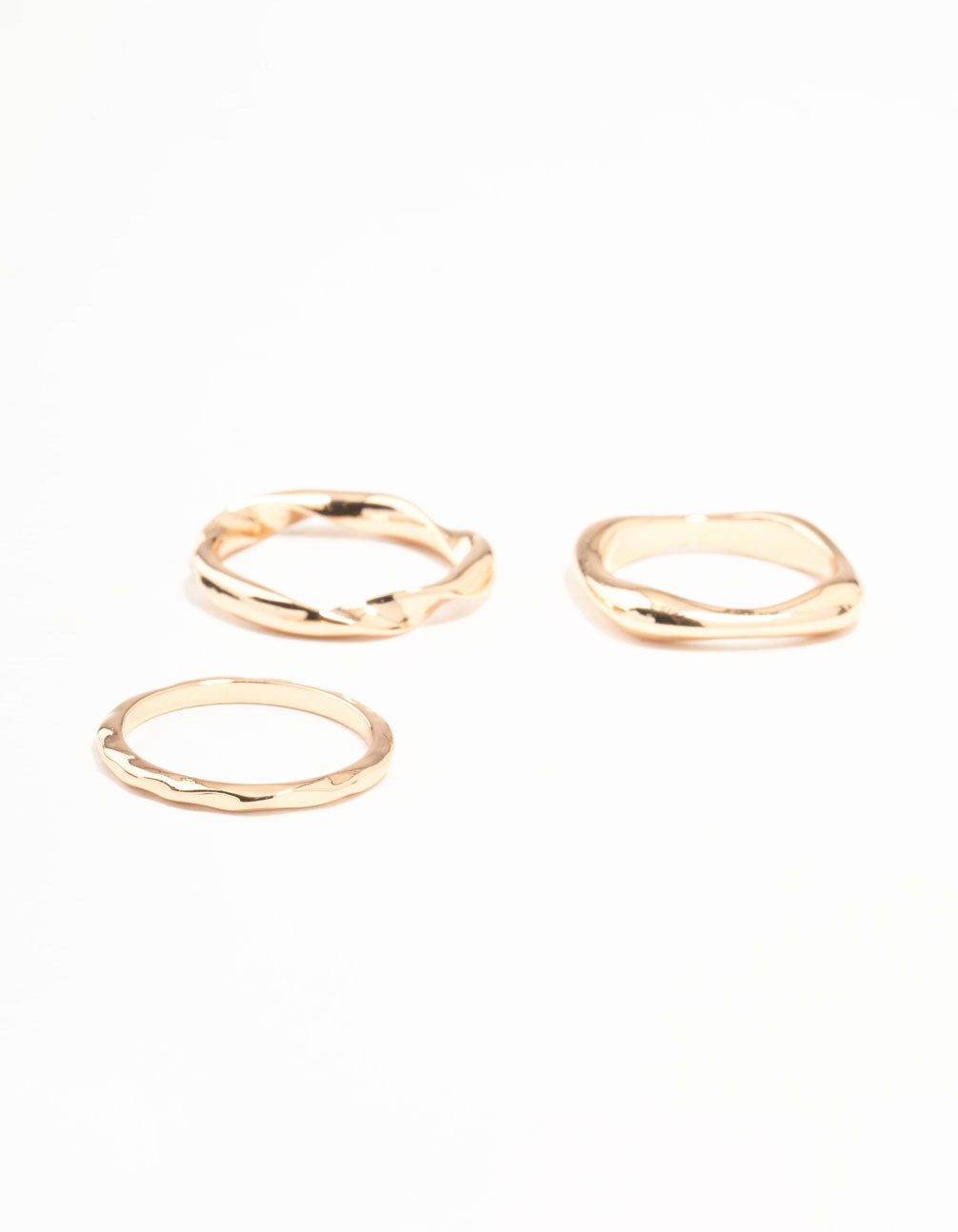 Add glamour to any outfit with these modern gold rings. Whether worn solo or layered, these statement rings will make you the center of attention. Embrace your unique style with this chic 3-pack.