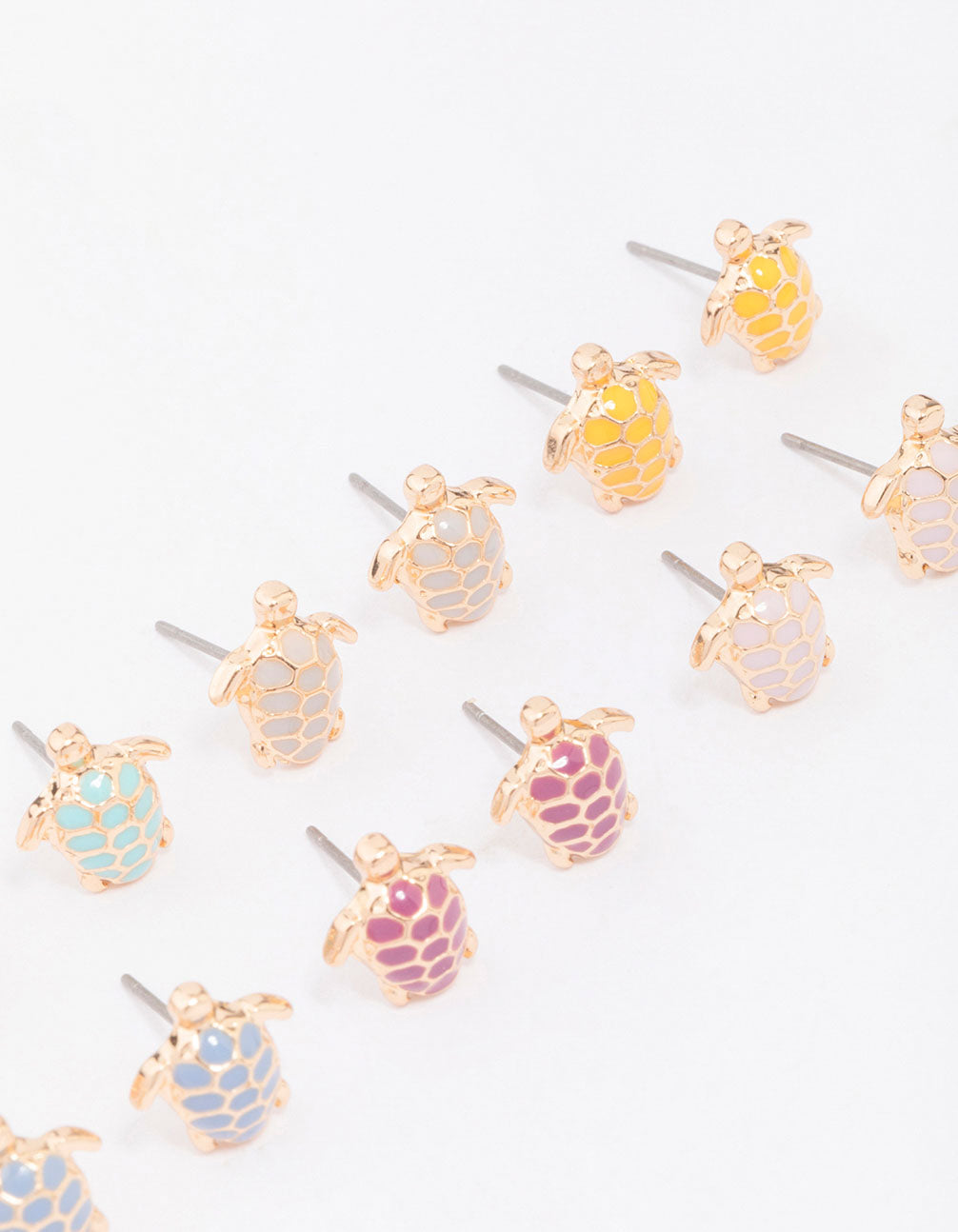 Create the ear stack of your dreams with this pack of gold-toned earrings. This earring pack includes eight sets of earrings, each adorned with rainbow-coloured turtle motifs.