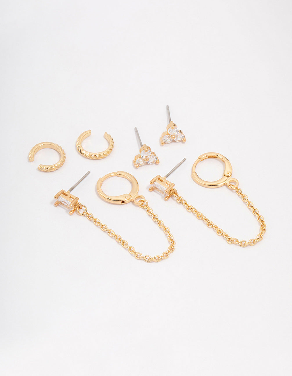 This set of earrings includes four pairs of gold plating huggie hoops and studs, perfect for styling together or solo in your stack.