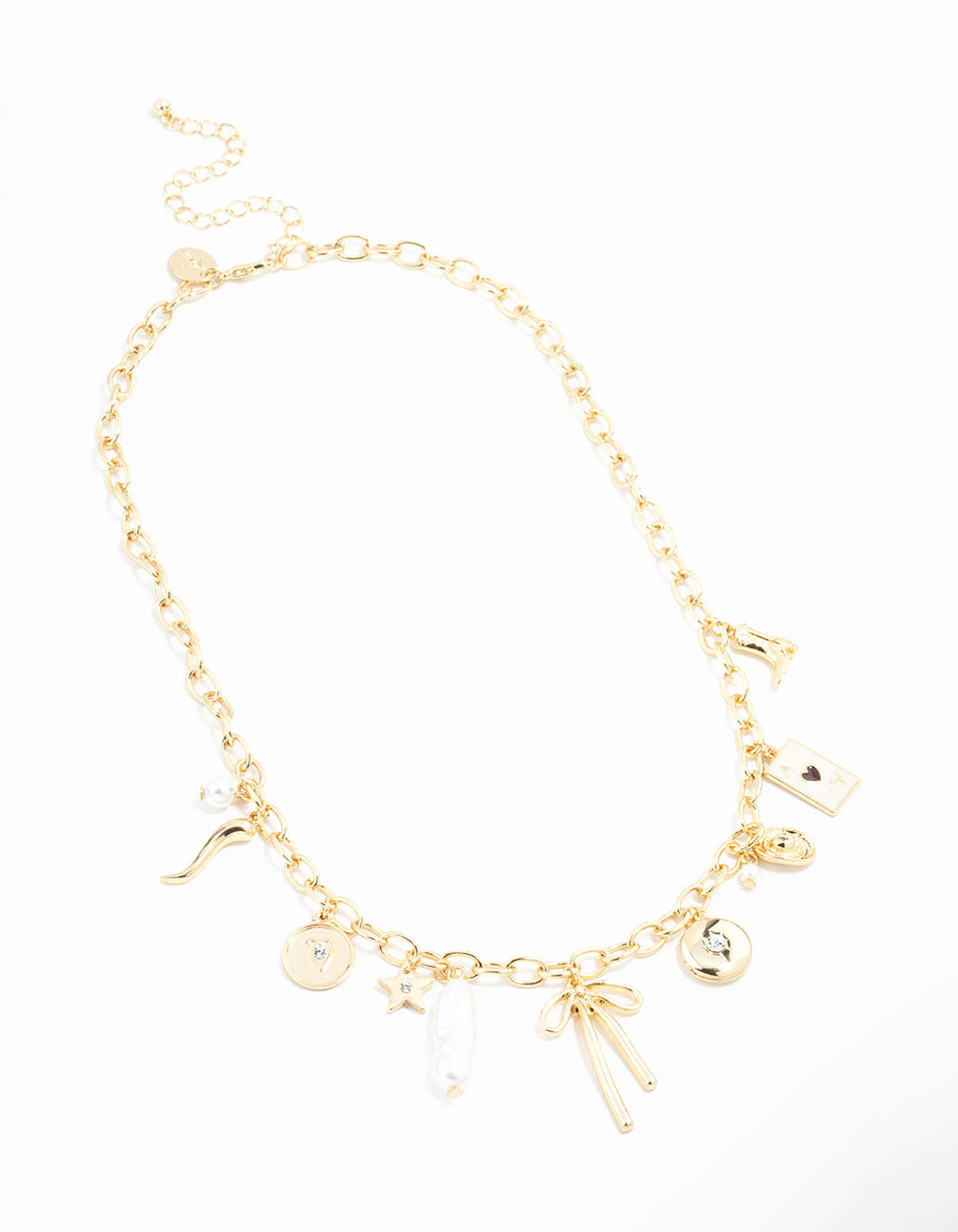 Add some flair with this stunning charm necklace! Featuring bow, heart, evil eye, boot, love letter, star, and more, it brings a unique and fun touch to any outfit.