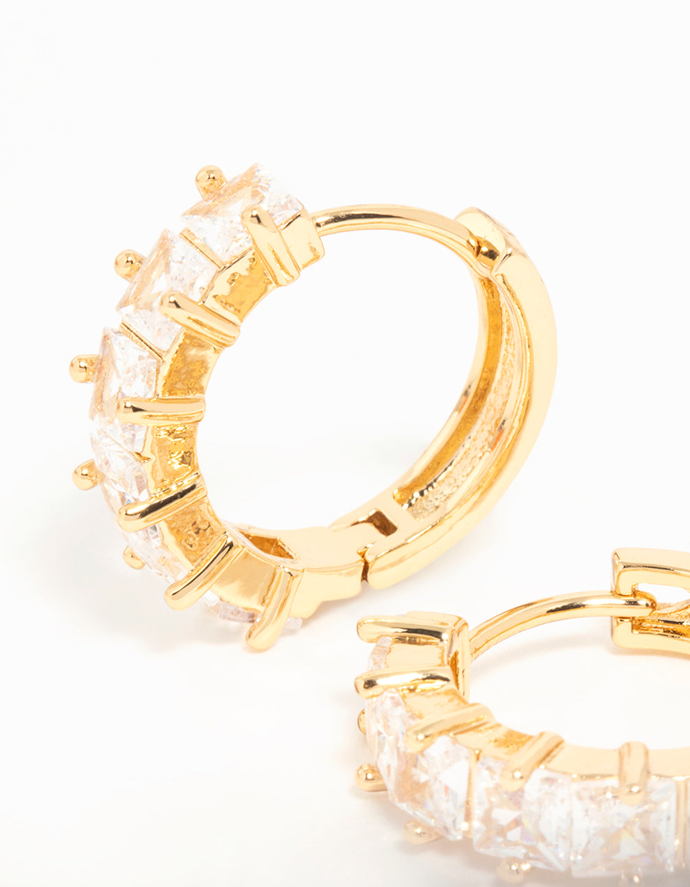Gold Plated Brass Cubic Zirconia Baguette Medium Huggie Earrings