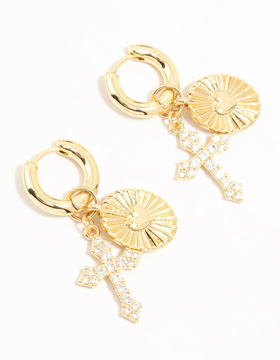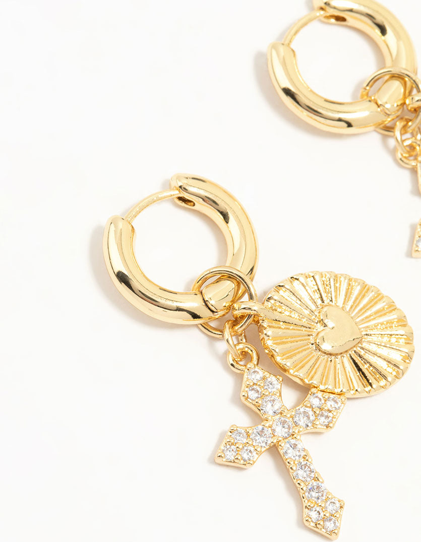 Add a touch of elegance with these gold-plated charm earrings! Featuring a sparkling cross and heart charm, they're perfect for a sophisticated look.