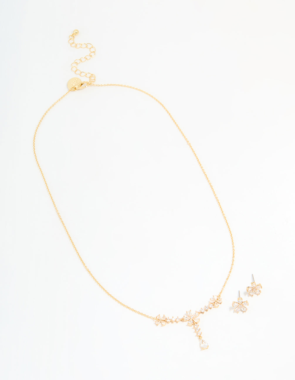 Gold Plated Cubic Zirconia Flower Drop Necklace & Earrings Set