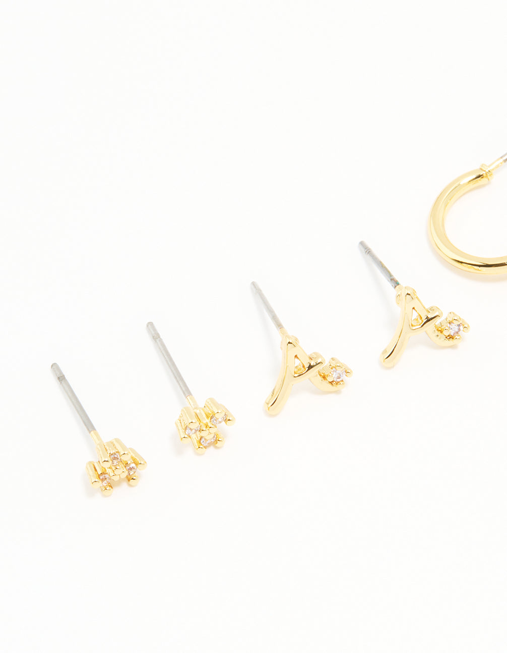 Gold Plated Cubic Zirconia Letter A Dainty Flower Earrings 4-Pack