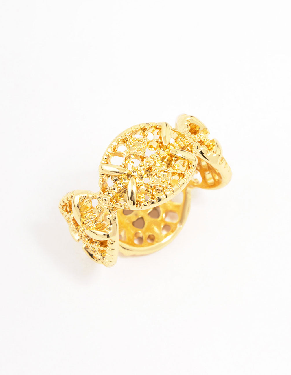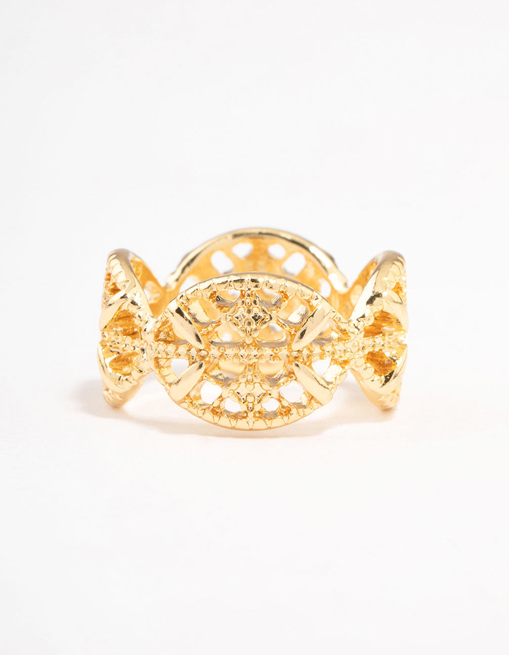 This unique band ring is plated with gold and features an intricate, filigree texture.