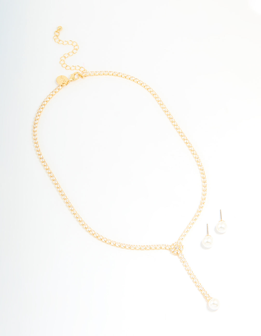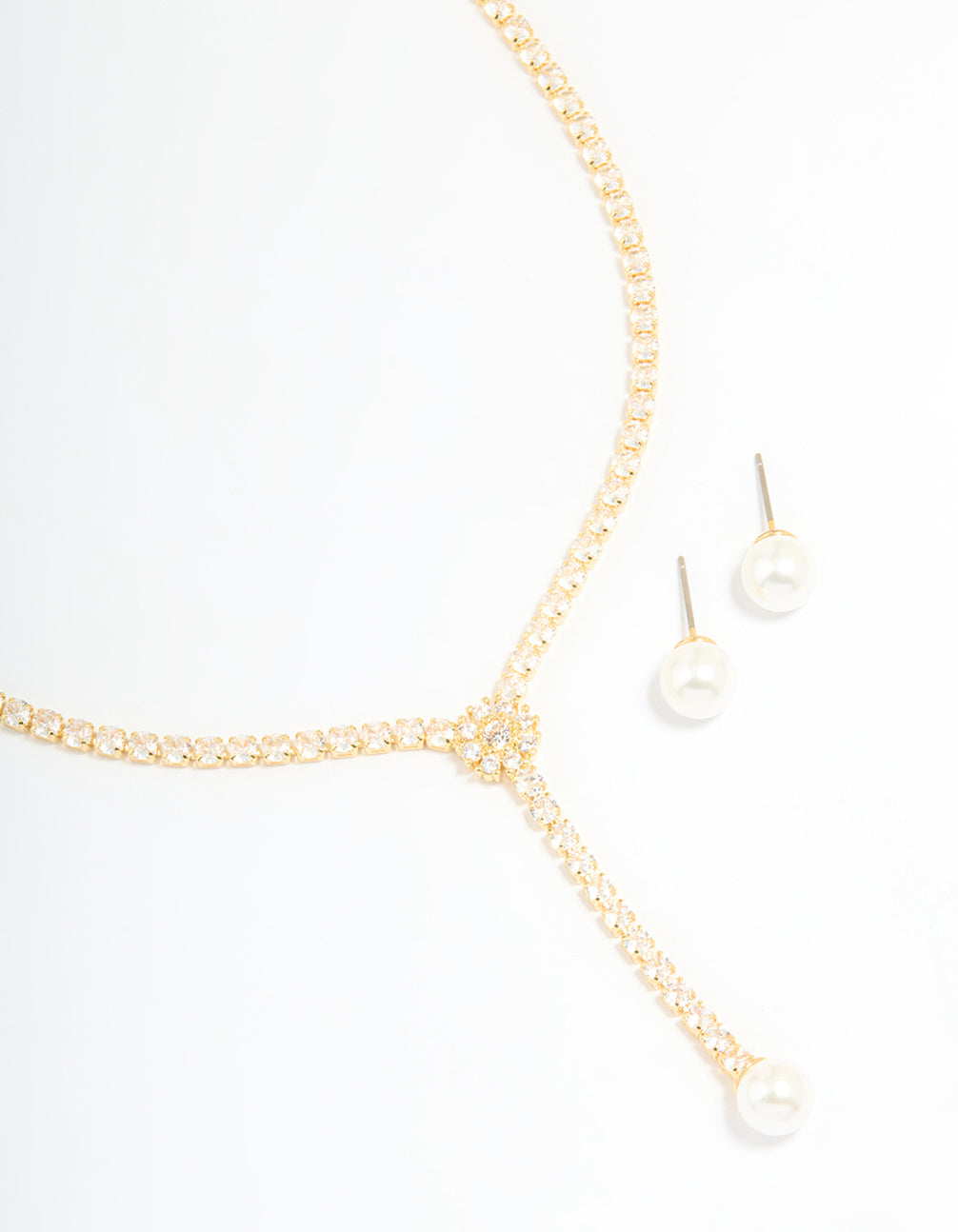 Gold Plated Pearl Flower Cubic Zirconia Y-Necklace & Earrings Set