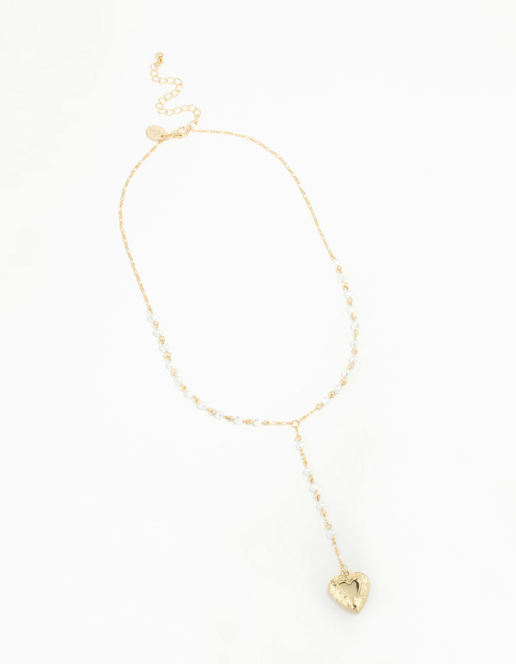 Enhance your charm and romance with this beautiful necklace. With a gold-toned base, pearls along the chain, and a heart-shaped locket, it's perfect for a playful yet romantic look.
