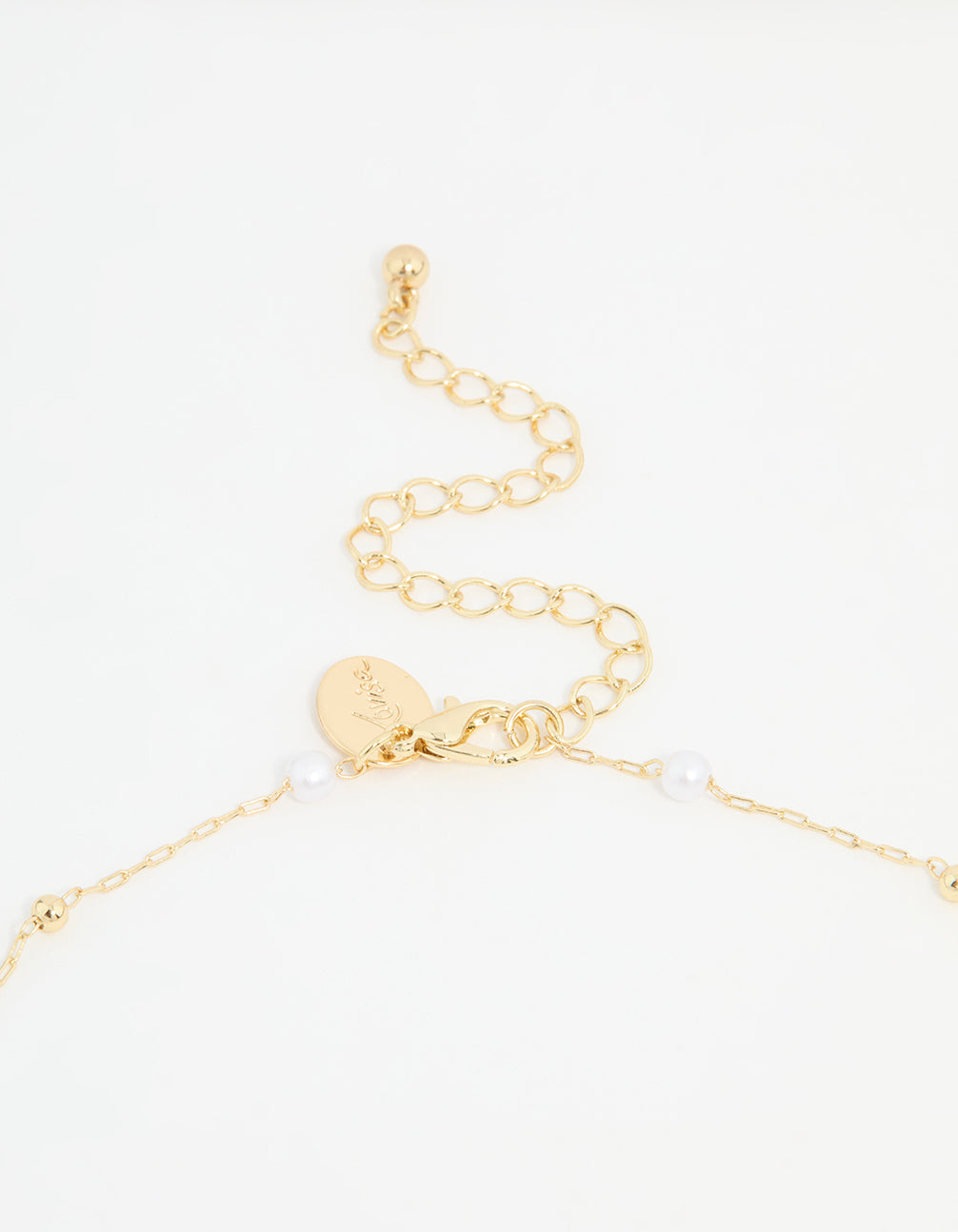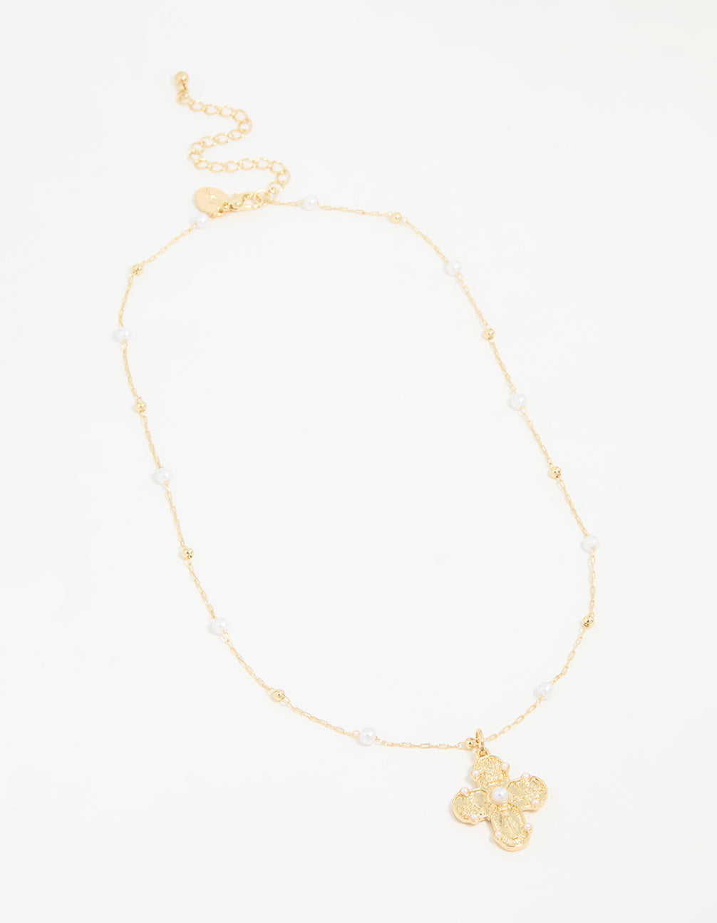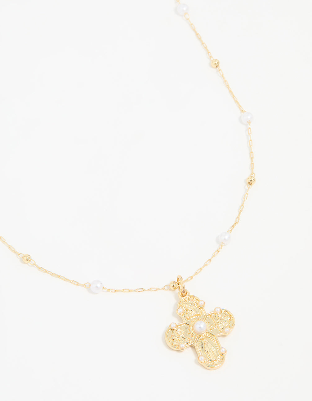 Make a statement and turn heads with this Gold Plated Pearl Station Cross Necklace! This chic piece features a delicate gold chain with lustrous pearls and a stunning cross pendant. Perfect for any outfit.