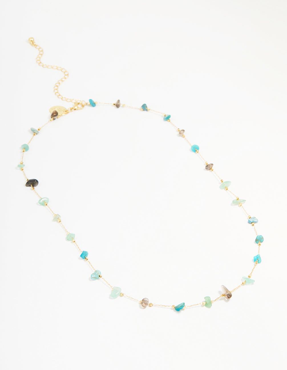 Elevate your style with this Gold Plated Semi Precious Stones Station Necklace. This chic piece features a gold-plated finish and semi-precious stones spaced delicately along the chain, creating a timeless design that works for any occasion. Whether you're dressing up for a wedding or adding a touch of sparkle to your everyday outfit, this necklace has you covered. Pair it with a classic dress for an effortlessly polished look, or layer it with other jewellery for stylish , stacked vibes. Ideal for those who love delicate necklaces, gemstone jewellery, or gold-plated accessories, this piece is a must-have for your collection!