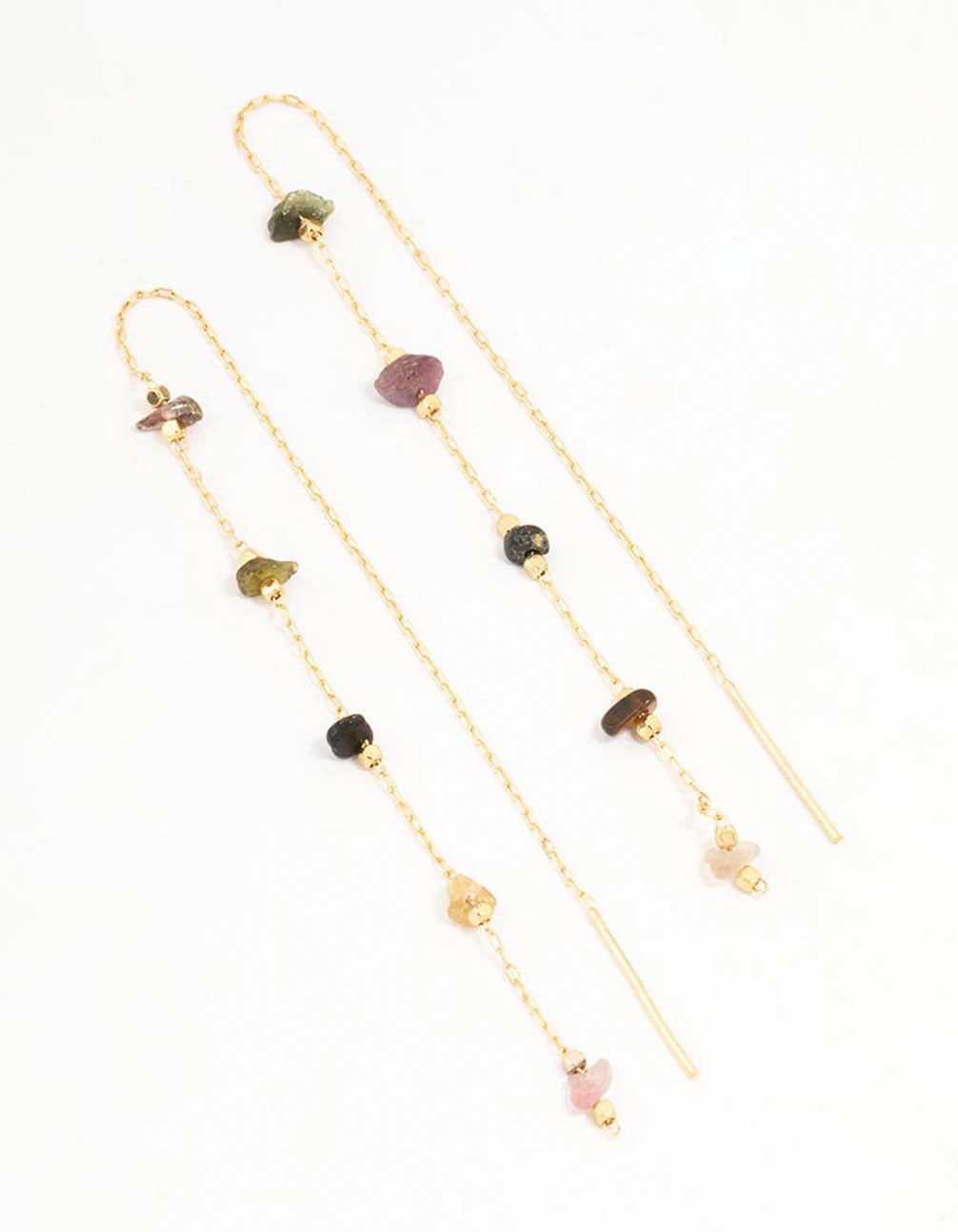 These drop earrings are great for some fun. With semi-precious stones cascading down gold-plated loops, they bring movement and charm to every look. Embrace their magic and unique easy-thread style for a standout accessory.