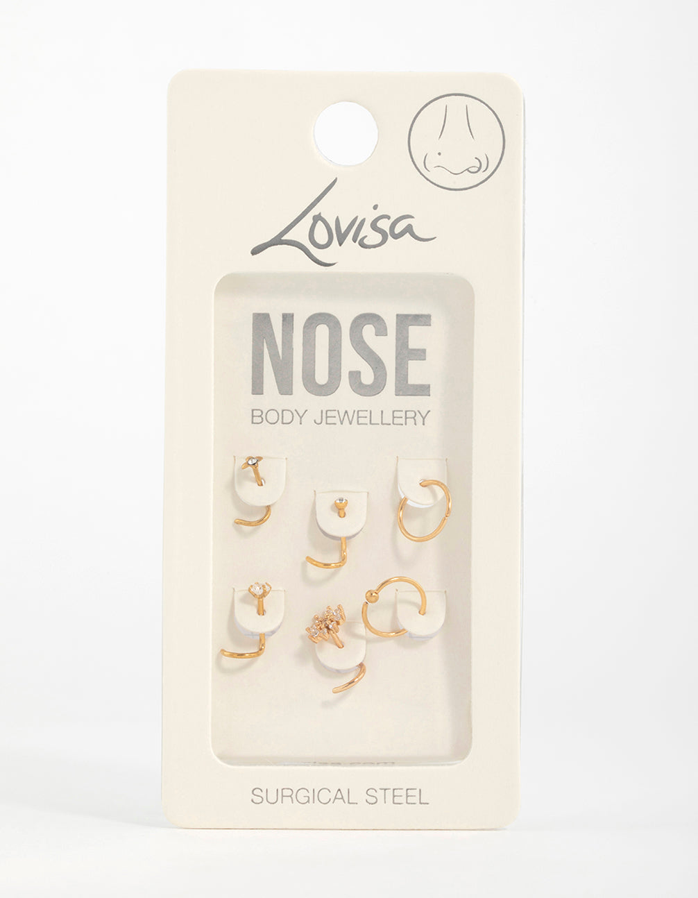 Upgrade your nose piercing game with this gold-plated surgical steel pack! Featuring six pieces with sparkling cubic zirconia accents, floral designs, and sleek rings and studs, it's perfect for a cool, stylish look.