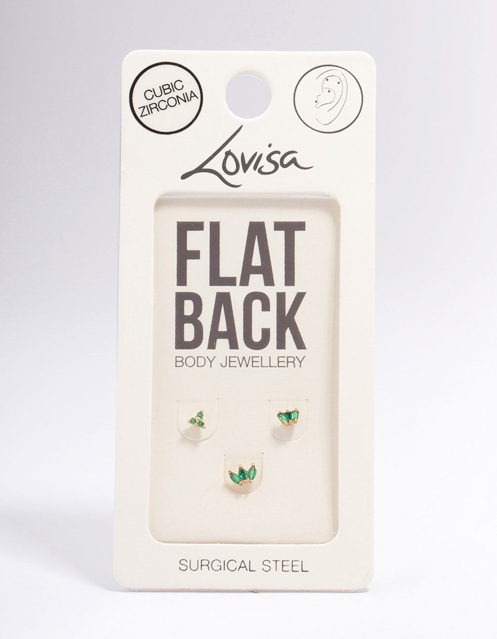 This earring pack contains three, gold plated flat backs — each adorned with emerald-coloured crystals for a pop of colour.