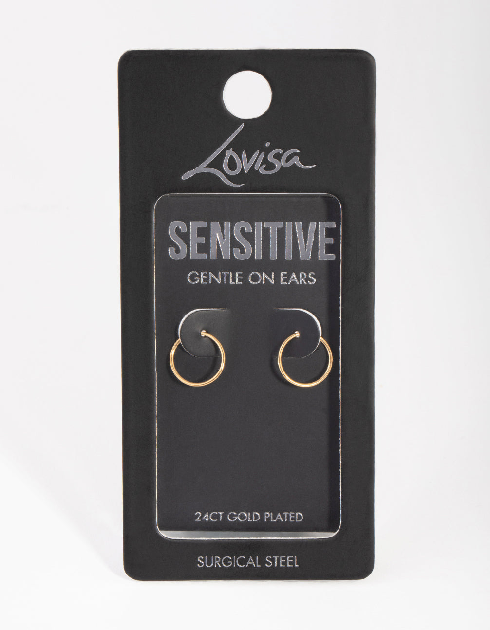Shine bright in these gold-plated surgical steel sleeper earrings. With a 10mm diameter, they effortlessly elevate any look. The hypoallergenic blend is perfect for sensitive ears, so you can rock these hoops all day long without irritation.