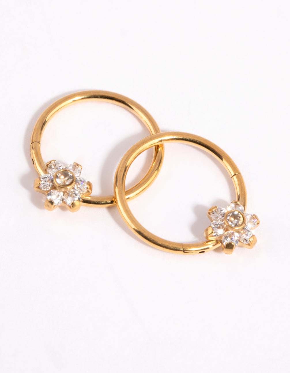 Add floral flair to your looks with these stunning floral hoop earrings. These hoop earrings are crafted from durable gold plated surgical steel for skin friendly wear and feature a pretty sparkly flower motif, perfect for adding a dose of glam.